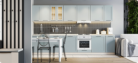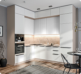 В расчет стоимости кухонного гарнитура входят: напольные шкафы и навесные полки с фасадами, фурнитура, ножки, петли, направляющие.