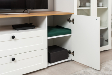 Остин – гостиная в современном классическом стиле. Лаконичность, строгие линии, контрастная фурнитура, функциональность и элегантность – отличительные черты этой коллекции.