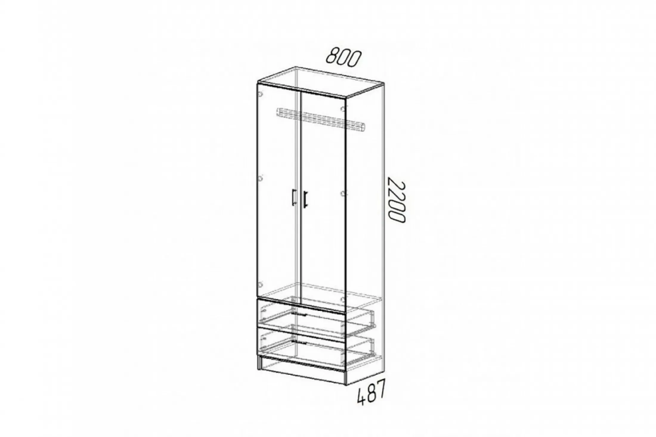 Шкаф ДУЭТ платяной имеет размеры 80 см в ширину, 48,7 см в глубину и 220 см в высоту, что позволяет оптимально использовать пространство в комнате.