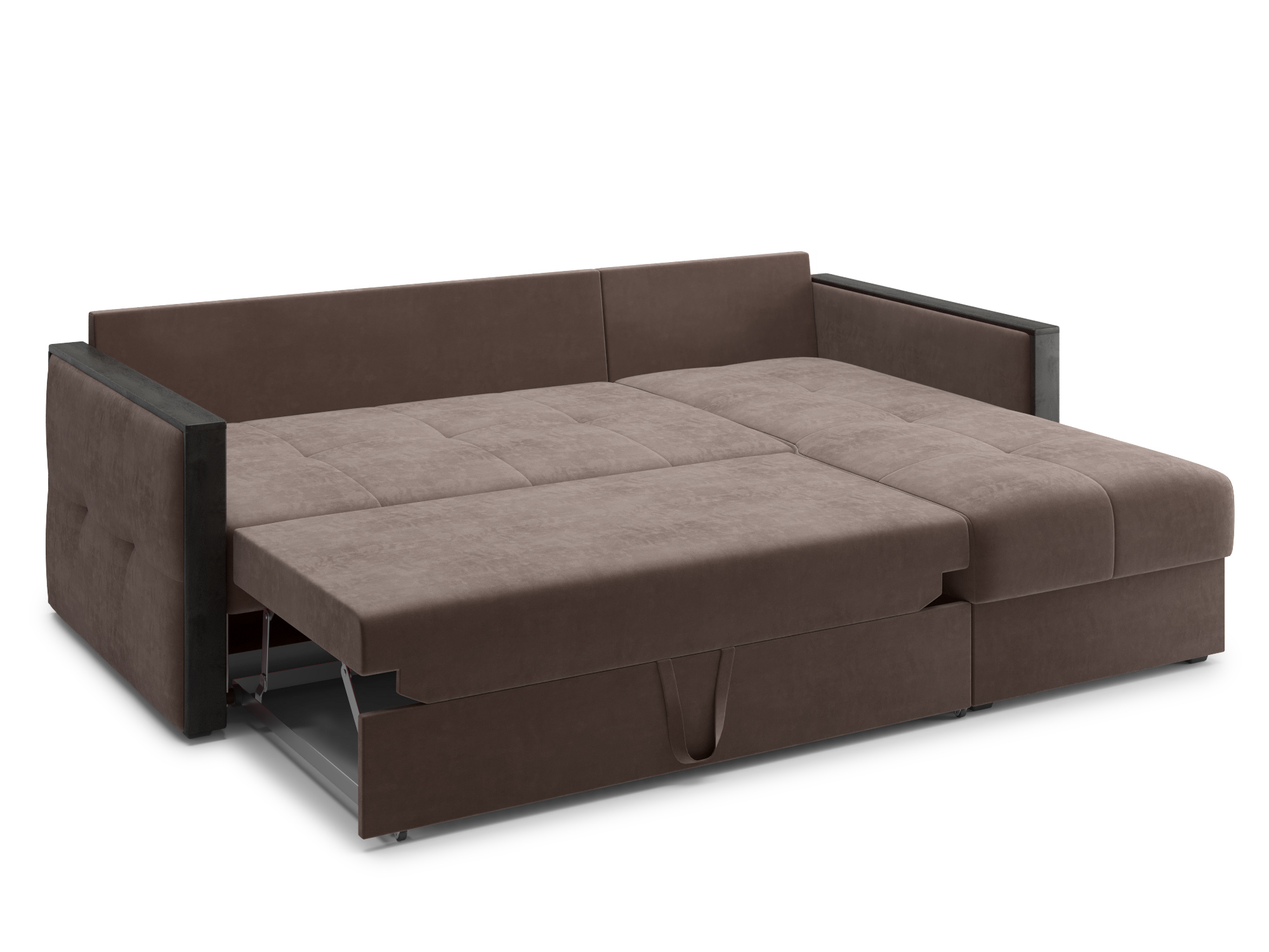 - Механизм раскладки дельфин — основан на выкатывании дополнительной платформы, скрытой под сидением дивана. Чтобы разложить диван, нужно потянуть за специальные ремешки, помогающие перемещать элементы конструкции. В результате этого действия нижняя часть дивана начнёт перемещаться. Делать это нужно до тех пор, пока часть не выдвинется максимально вперед. Затем следует немного приподнять элемент и упереть в противоположную часть, которая осталась неподвижной. Под сиденьем дивана находится короб для хранения вещей и постельных принадлежностей.