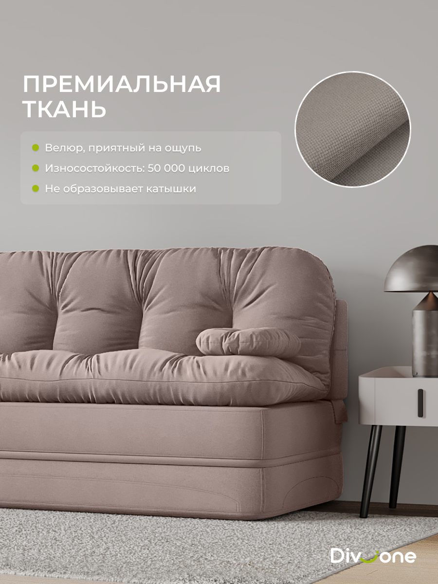 Мы понимаем, насколько важна целостность визуального образа. Именно поэтому наша коллекция включает кресла, выполненные в аналогичных цветовых решениях. Наши бескаркасные диваны трансформеры для городской квартиры и загородной дачи изготовлены из материалов высокого качества. Основа выполнена из ППУ (Пенополиуретан) толщиной сорок сантиметров, что обеспечивает упругость. Велюр имеет износостойкость — 50 000 циклов по тесту Мартиндейла, что более чем вдвое превышает стандартные требования (20 000). Наполнение верхнего матраса и декоративных подушек представляет собой смесь упругой поролоновой крошки и воздушного синтепуха. Такой состав препятствует быстрой усадке, эффективно поддерживает первозданную форму изделия и продлевает его срок службы на долгие годы. Таким образом, долговечность и сохранение превосходного внешнего вида гарантированы. Не требует сборки. Спецпредложение! Спешите купить товар с гарантия качества от производителя по выгодной цене.