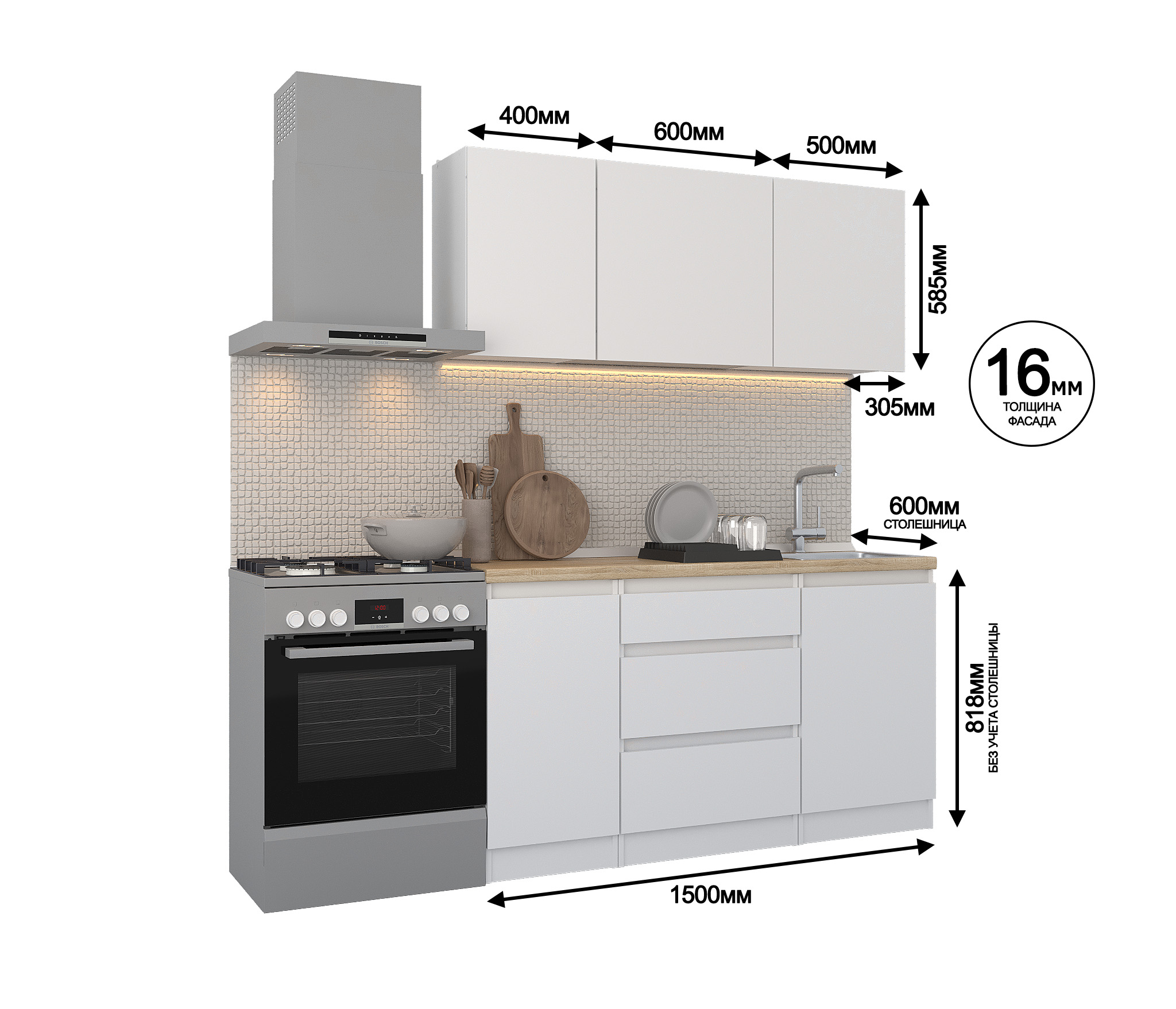 Кухонный гарнитур Леон прямой 150 см, белый (Белый)