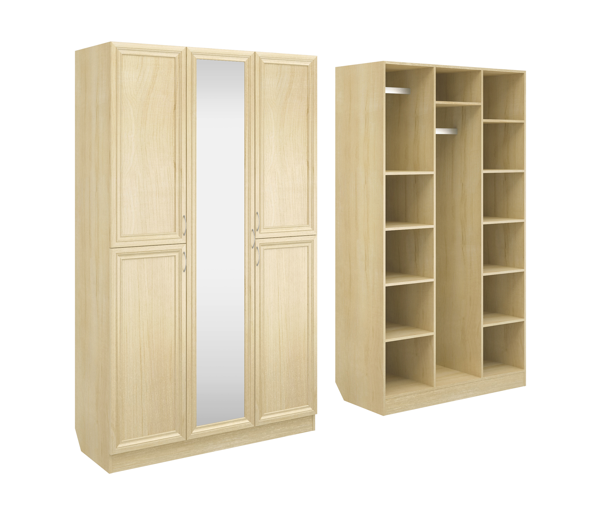 Корпус шкафа выполнен из Ламинированной ДСП высокого качества с насыщенным цветом. Фасады выполнены из материала МДФ.Шириною 120 см., большая и функциональная модель с отделениями закрытыми на пять распашных дверей. Вверху слева небольшое отделение со штангой, внизу слева две полки. Справа за двумя дверьми шесть ниш. За центральной дверцей сверху узкая ниша и отделение со штангой.В данной моделе установлено зеркало, которое вмонтировано на производстве в рамку фасада двери шкафа.