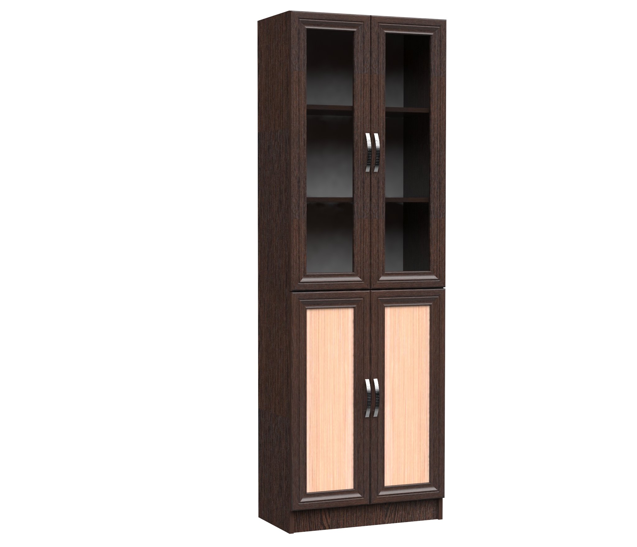 Шкаф шк-2/4-1800 изготовлен из качественной ЛДСП.Фасады верхние стекло в рамке МДФ,Нижние глухие.Шкаф оснащён 3-мя полками,2-ве из них съёмные.Ширина 60 см,высота 180 см,глубина 32 см.Верхняя дверь высота 95 см,нижняя 75.6.Можно использовать для разных целей.Книги,игрушки,посуда и т.д.Стекло тонированное.