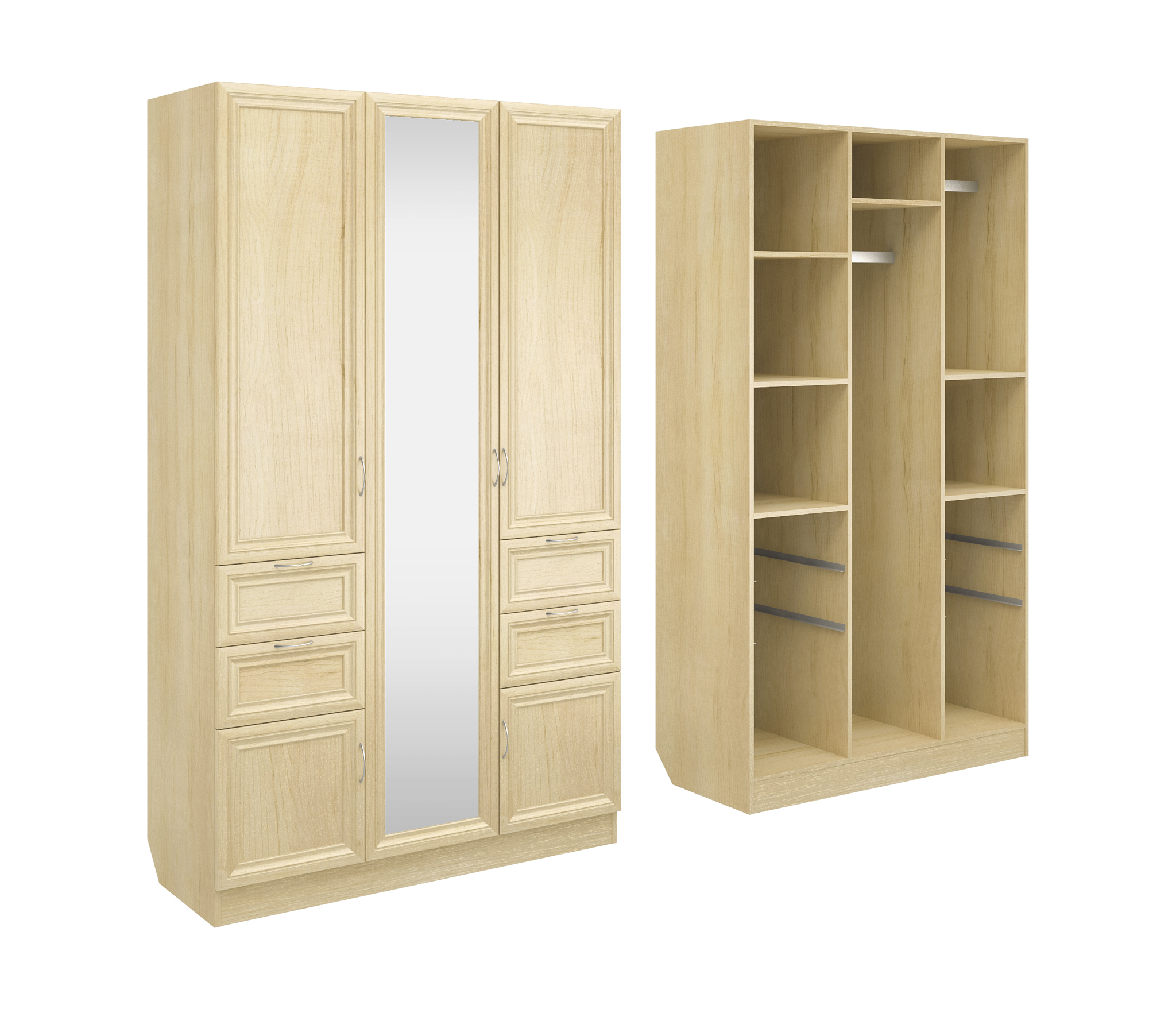 Корпус шкафа выполнен из Ламинированной ДСП высокого качества с насыщенным цветом. Фасады выполнены из материала МДФ.Большая и функциональная модель шириною 120 см., со множеством отделений закрытыми пятью распашными дверками. Вверху слева за дверью четыре ниши. Справа отделение со штангой и ниша внизу. Слева и Справа симметрично друг другу расположены по два выкатных ящика, и по две ниши с небольшими распашными дверцами. За центральной дверью большая, вертикальная секция со штангой для вешалок.В данной моделе установлено зеркало, которое вмонтировано на производстве в рамку фасада двери шкафа