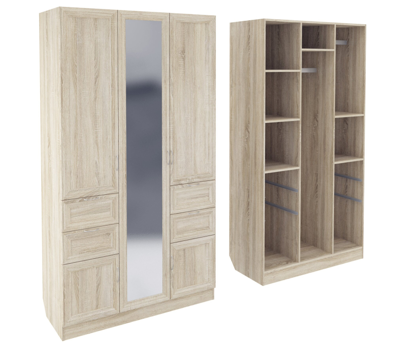 Корпус шкафа выполнен из Ламинированной ДСП высокого качества с насыщенным цветом. Фасады выполнены из материала МДФ.Большая и функциональная модель шириною 120 см., со множеством отделений закрытыми пятью распашными дверками. Вверху слева за дверью четыре ниши. Справа отделение со штангой и ниша внизу. Слева и Справа симметрично друг другу расположены по два выкатных ящика, и по две ниши с небольшими распашными дверцами. За центральной дверью большая, вертикальная секция со штангой для вешалок.В данной моделе установлено зеркало, которое вмонтировано на производстве в рамку фасада двери шкафа