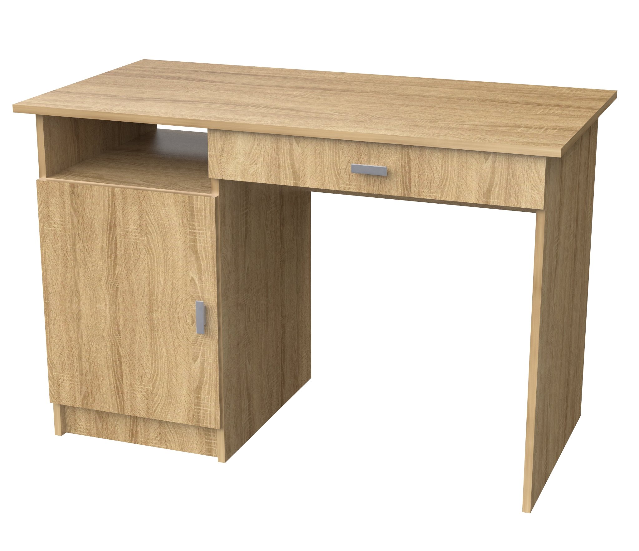 Стол СТ-7 изготовлен из ЛДСП.Оснащён тумбой с дверью,за дверцей полка съёмная+большой ящик с другой стороныСборка только как на фото,на другую сторону не предусмотрено..Ширина 110 см,Выс 75 см,глуб 57 см.Удобен в использовании как для кабинета,так и для школьников.