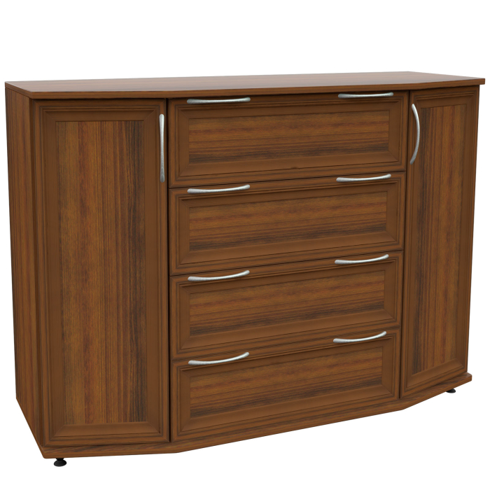 комод 1 отличается большими размерами и многофункциональностью.4-ре больших выдвижных ящика + 2 двери по бокам скрывают полки,позволяет разместить как крупные,так и мелкие вещи.Корпус ЛДСП,фасады рамочные МДФ.Оснащён пластиковыми ножками.Производитель оставляет за собой право менять фурнитуру.