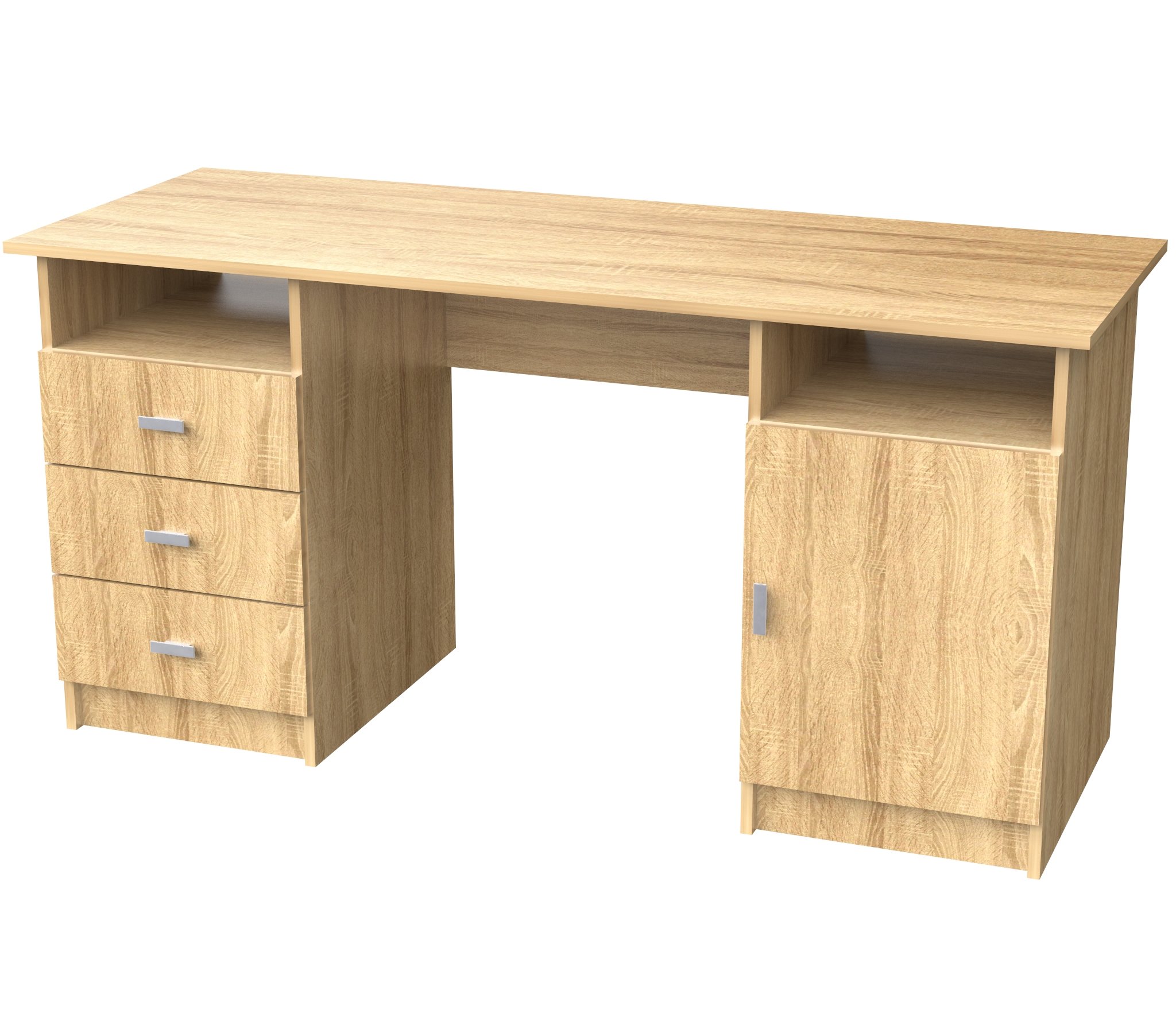 Стол СТ-8 изготовлен из ЛДСП.Оснащён 2-мя тумбами по бокам,одна тумба с дверью,за дверцей полка съёмная),другая оснащена выдвижными ящиками.Ширина 148,4 см,Выс 75 см,глуб 57 см.Удобен в использовании как для кабинета,так и для школьников.