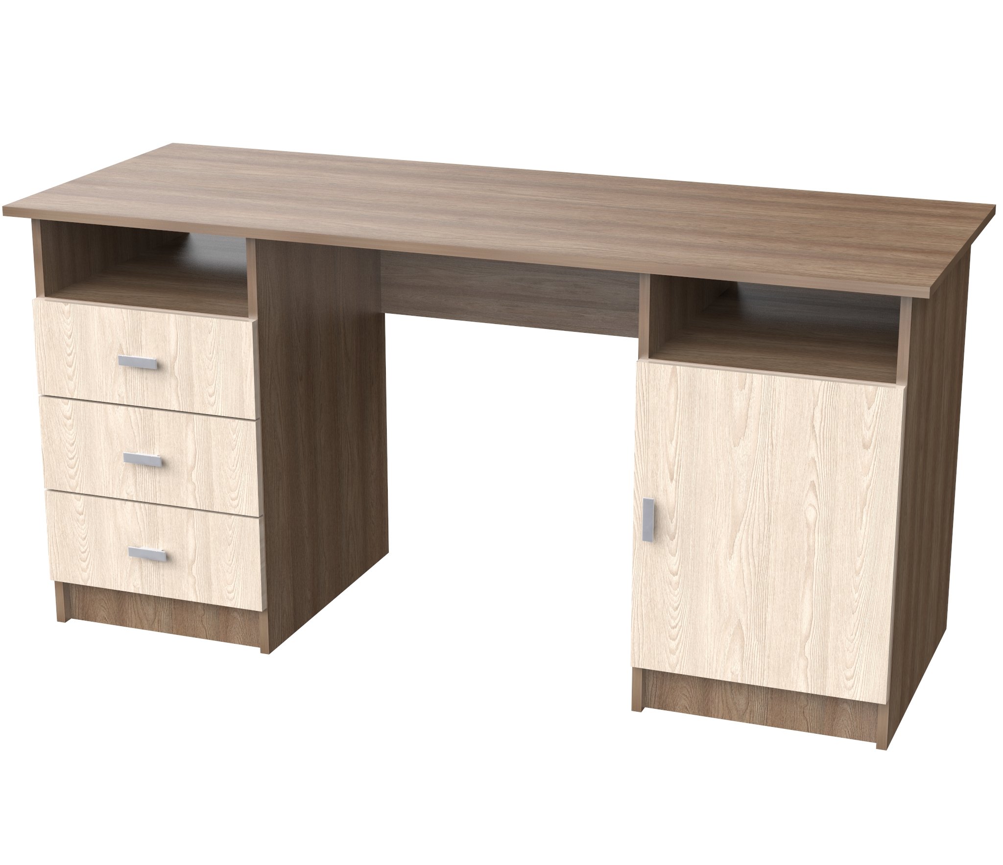 Стол СТ-8 изготовлен из ЛДСП.Оснащён 2-мя тумбами по бокам,одна тумба с дверью,за дверцей полка съёмная),другая оснащена выдвижными ящиками.Ширина 148,4 см,Выс 75 см,глуб 57 см.Удобен в использовании как для кабинета,так и для школьников.