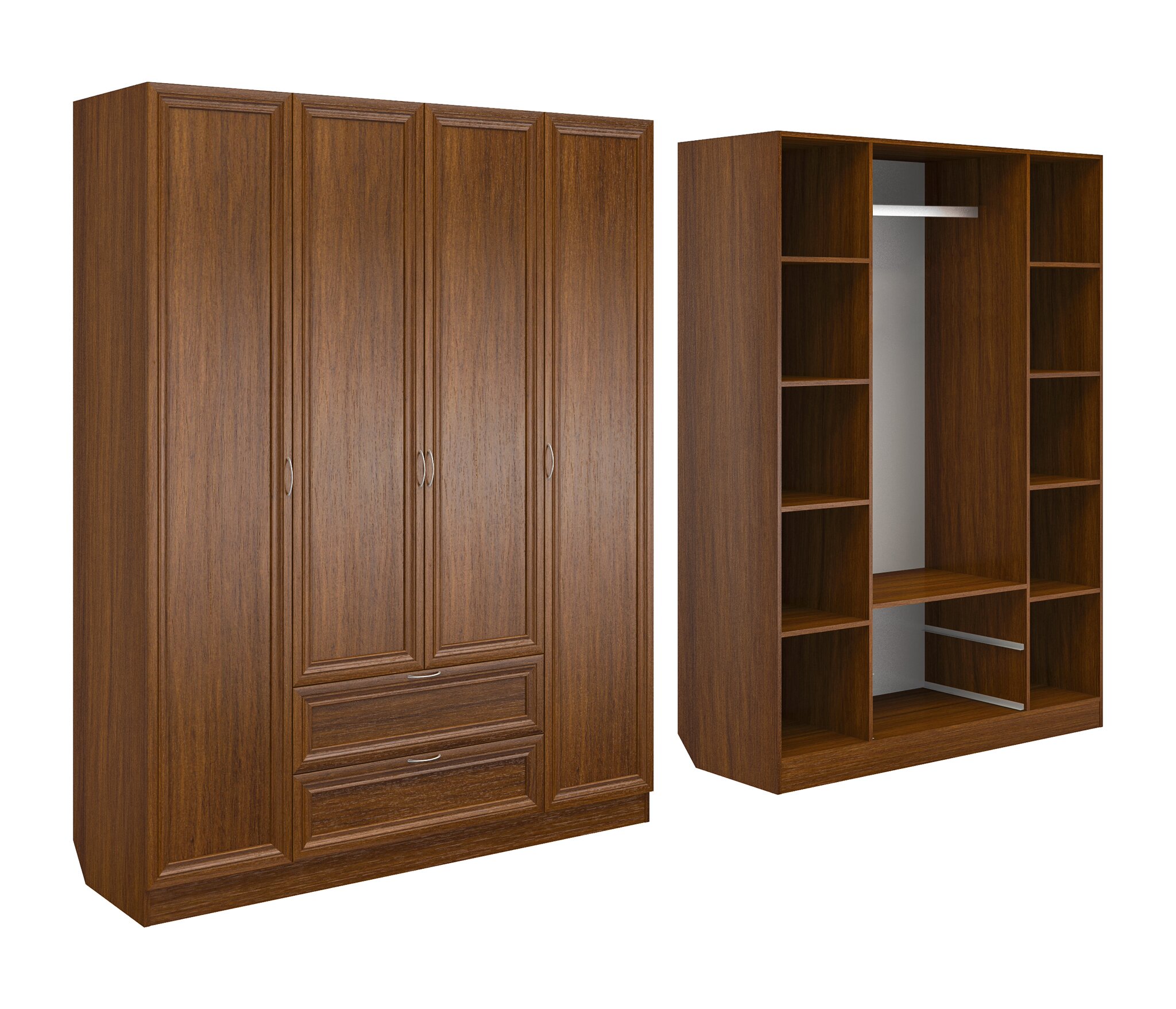 Корпус шкафа выполнен из Ламинированной ДСП высокого качества с насыщенным цветом. Фасады выполнены из материала МДФ.Шириною 160 см., красивый четырехстворчатый шкаф. Слева и справа секции, по четыре полки в каждой.