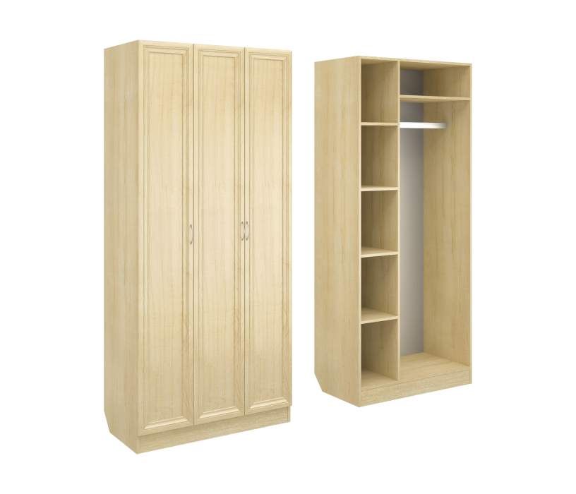 Корпус шкафа выполнен из Ламинированной ДСП высокого качества с насыщенным цветом. Фасады выполнены из материала МДФ.Шириною 110 см., большая и функциональная трёхстворчатая модель. В левой секции ниши для сложенных вещей. Справа штанга для одежды.