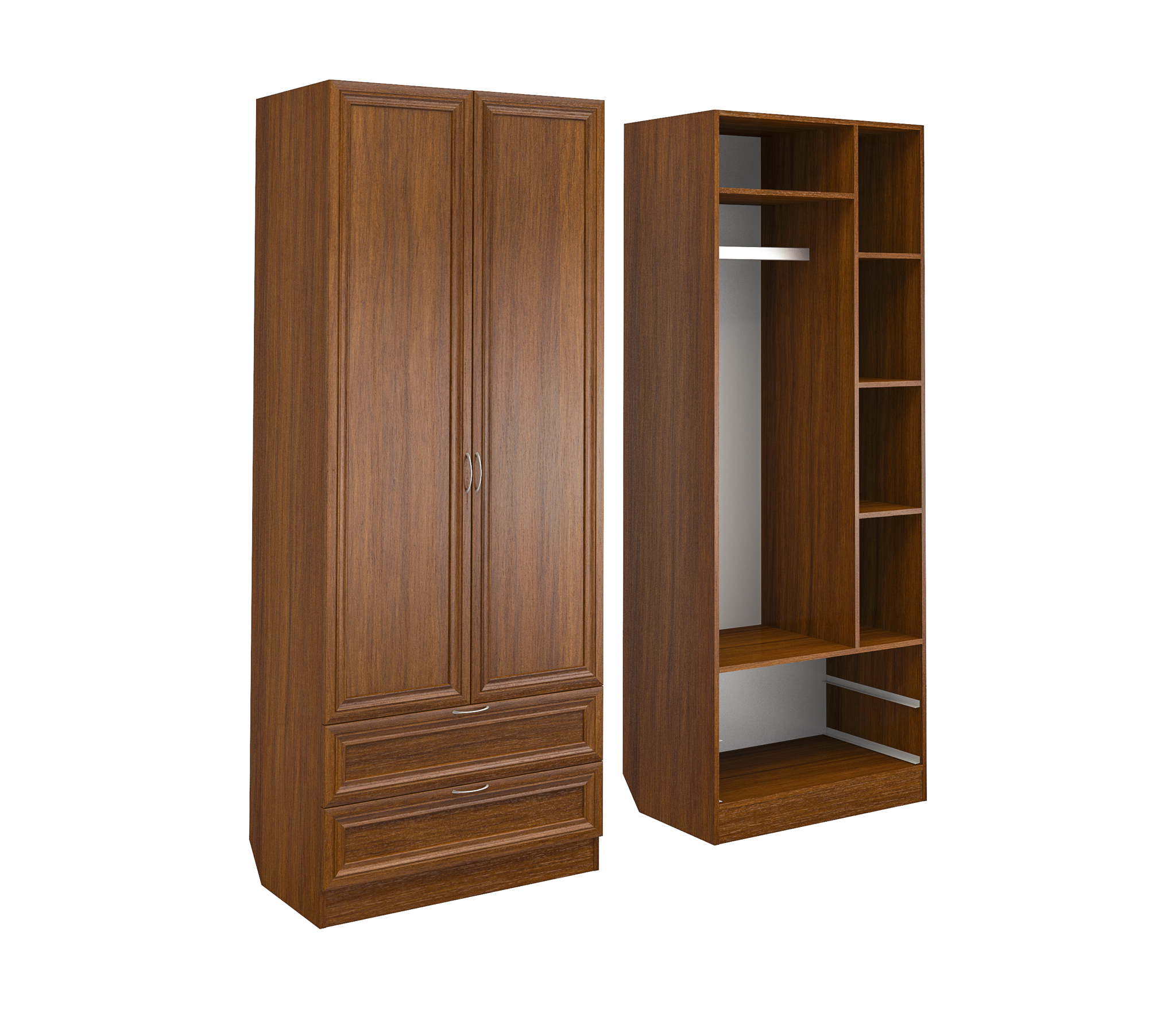 Корпус шкафа выполнен из Ламинированной ДСП высокого качества с насыщенным цветом. Фасады выполнены из материала МДФ.Шириною 80 см., эта многофункциональная модель несет в себе следующие элементы. За распашными дверьми штанга для одежды с одной стороны и стеллаж с полками с другой. Внизу расположены два выдвижных ящика.