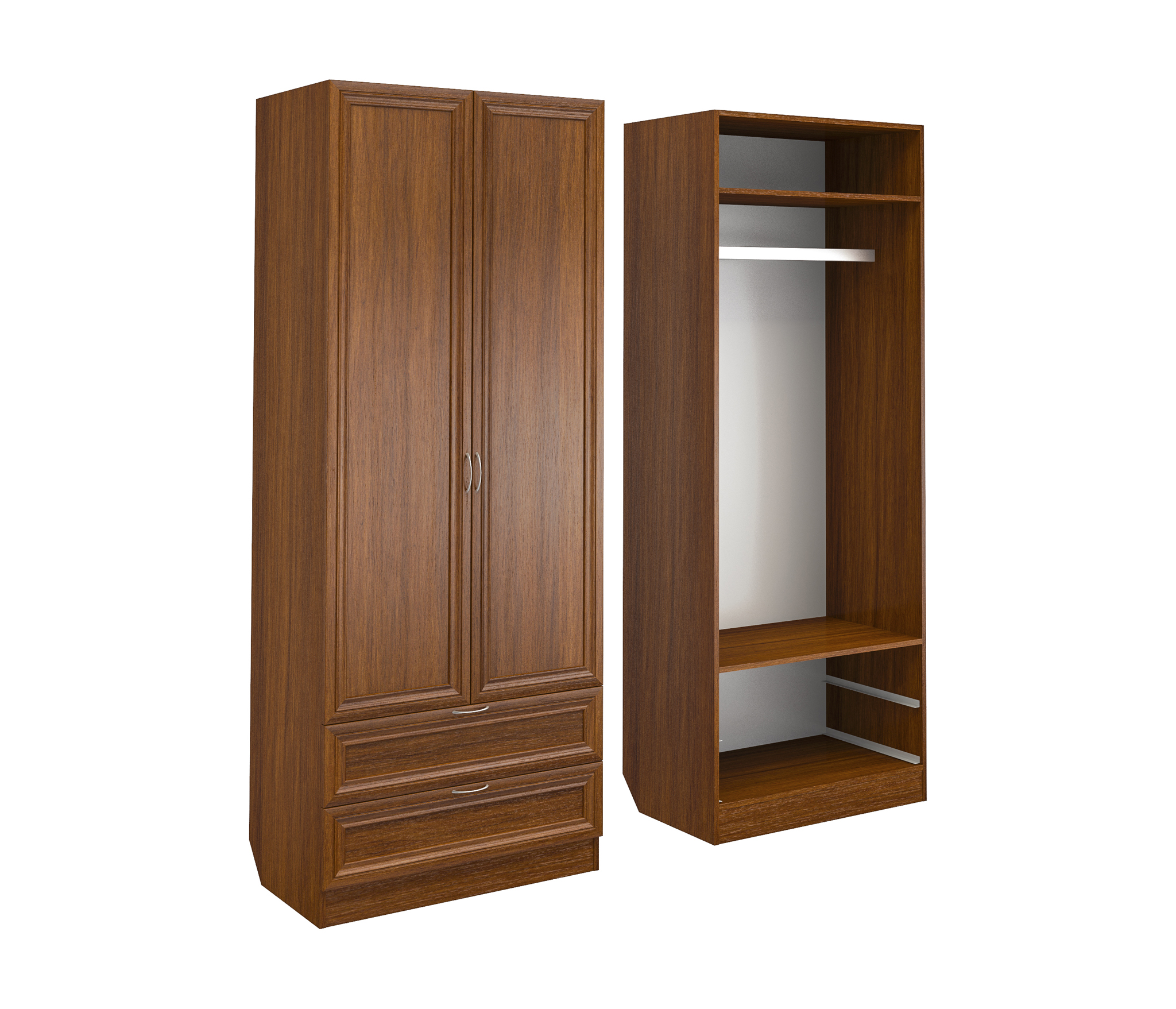 Корпус шкафа выполнен из Ламинированной ДСП высокого качества с насыщенным цветом. Фасады выполнены из материала МДФ.Шириною 80 см., эта многофункциональная модель несет в себе следующие элементы. За распашными дверьми находится штанга для одежды. Внизу расположены два выдвижных ящика.