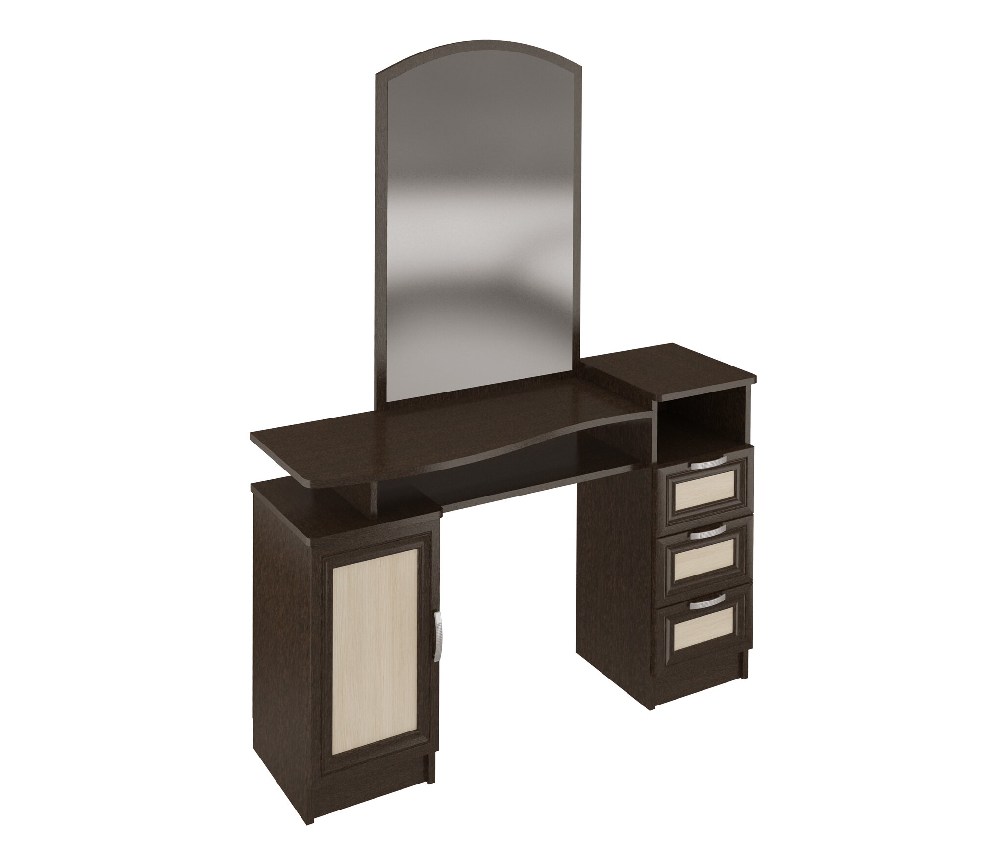 Корпус туалетного столика выполнен из Ламинированной ДСП высшего качества с насыщенным цветом. Рамка фасадов в плёнке МДФ.В комплект входит вся необходимая фурнитура.Удобный и функциональный в использовании.С дверцей с одной стороны и 3-мя выдвижными ящиками с другой стороны.