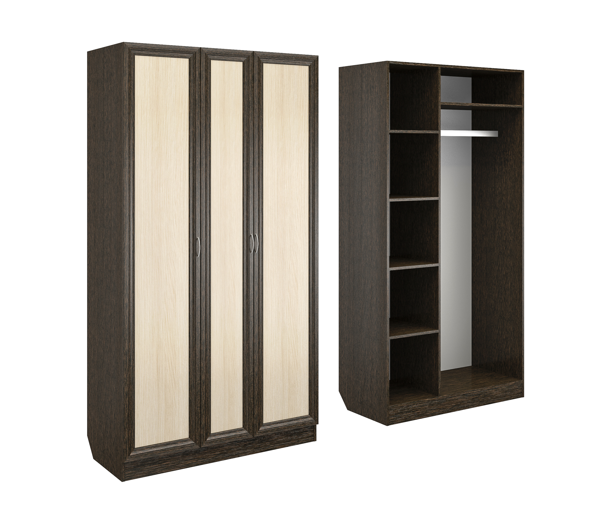 Корпус шкафа выполнен из Ламинированной ДСП высокого качества с насыщенным цветом. Фасады выполнены из материала МДФ.Ширина шкафа 90 см., большая и функциональная трёхстворчатая модель. В левой секции ниши для сложенных вещей. Справа штанга для одежды.