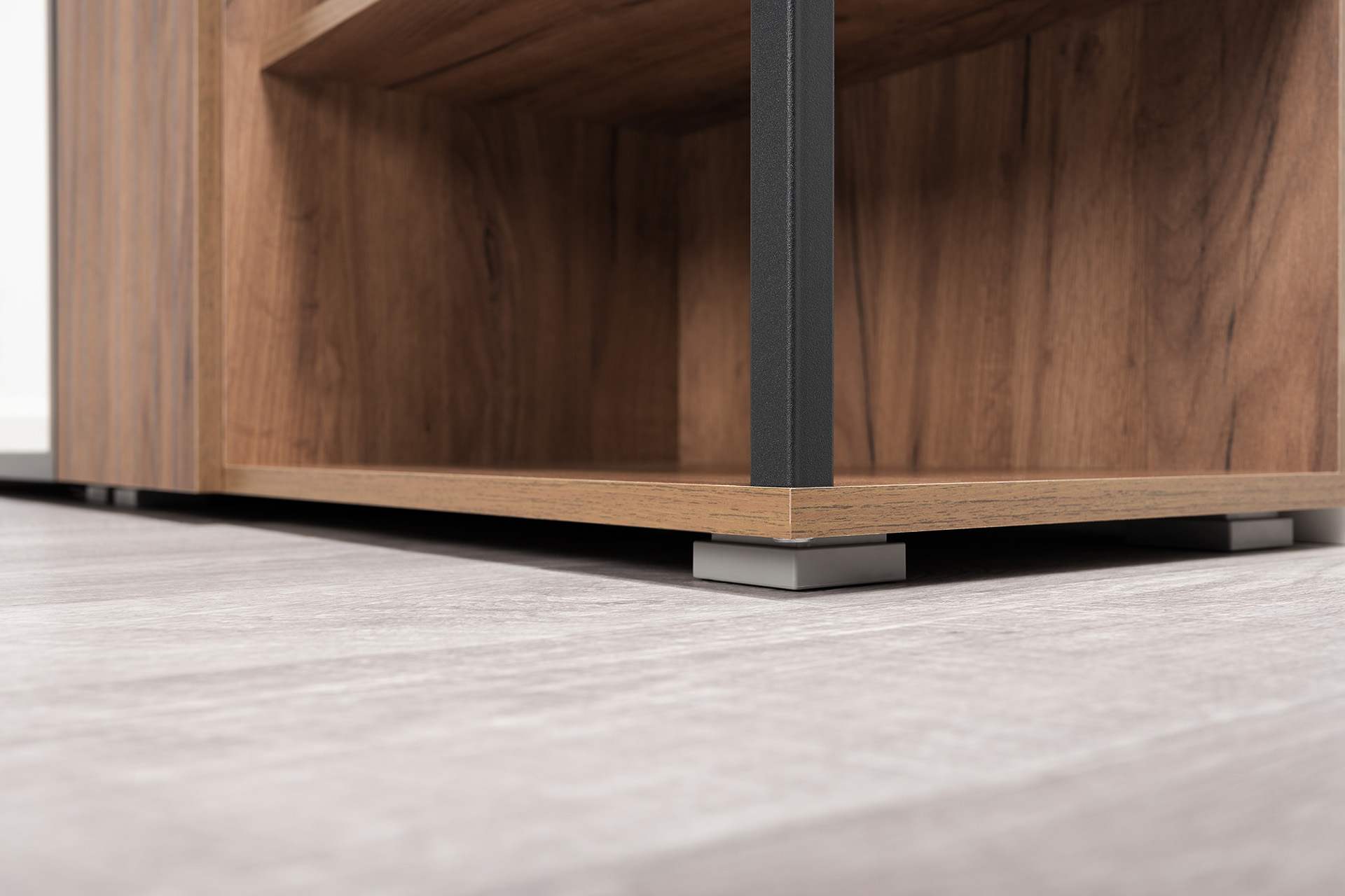 Металлические стойки, открытые полки и вертикальные линии на фасадах создают ощущение легкости и воздуха.