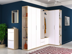 Модульная линейка Куба — практичность, удобство и красота! Предлагаем сотворить свой собственный, уникальный мир любимого дома, прямо начиная с порога, при помощи мебели для прихожей Куба. Дизайнеры, объединив эстетику и передовую технологию, создали элегантную коллекцию в современной стилистике. Пастель и древесная фактура корпусов прихожей Куба согревают природной теплотой визуальную прохладу белоснежных фасадов мебели. Актуальный тренд — минимальное декорирование мебели позволяет сформировать лаконичные, интересные ансамбли для любых помещений. Коллекцию Куба представляют 11 предметов — навесные полка, вешалка и зеркало, 3 модели обувницы, стеллаж и 4 вида шкафа для одежды. Модули прихожей Куба способны, буквально на нескольких квадратных метрах, создать комфортный, функциональный и безопасный интерьер. Для больших холлов и офисов из набора для прихожей Куба можно собрать бесконечное количество оригинальных композиций. Незамысловатые формы и абсолютная эргономичность прихожих Куба делают благородную элегантность интерьеров по-домашнему уютной. Корпуса и фасады мебели Куба выполнены из ламинированной ДСП 16 мм. Опоры — серый пластик, лицевая фурнитура — металл, цвет белый. Современная фурнитура, использованная в производстве прихожей Куба, отличается высокой надёжностью и долговечностью. Распашные двери модулей Куба на четырёхшарнирных петлях, выдвижные ящики на шариковых направляющих полного выдвижения.