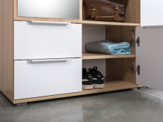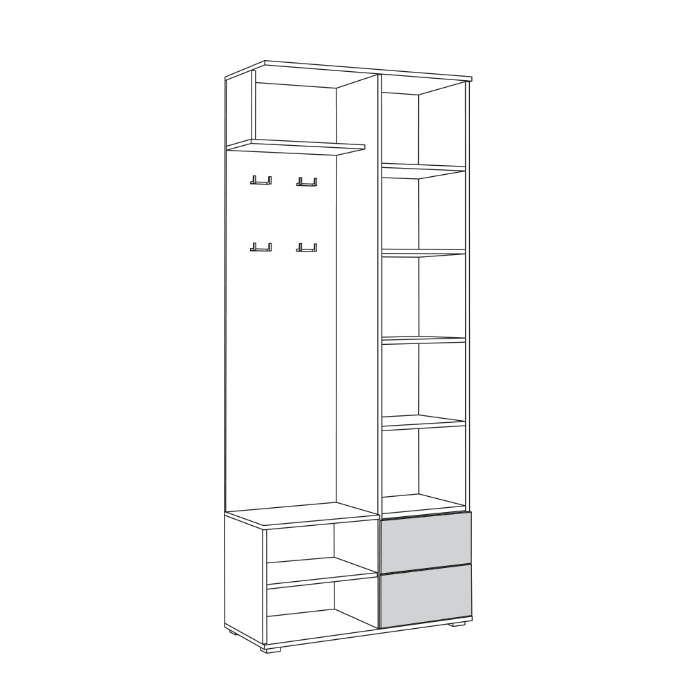 Открытая вешалка, с четырьмя крючками для одежды, имеет антресольную полку для головных уборов и распашное отделение для обуви.