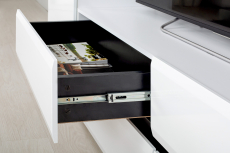Тумба оборудована четырьмя выдвижными ящиками на шариковых направляющих, что обеспечивает легкое открывание. Фасады открываются за край, позволяя отказаться от использования ручек.
