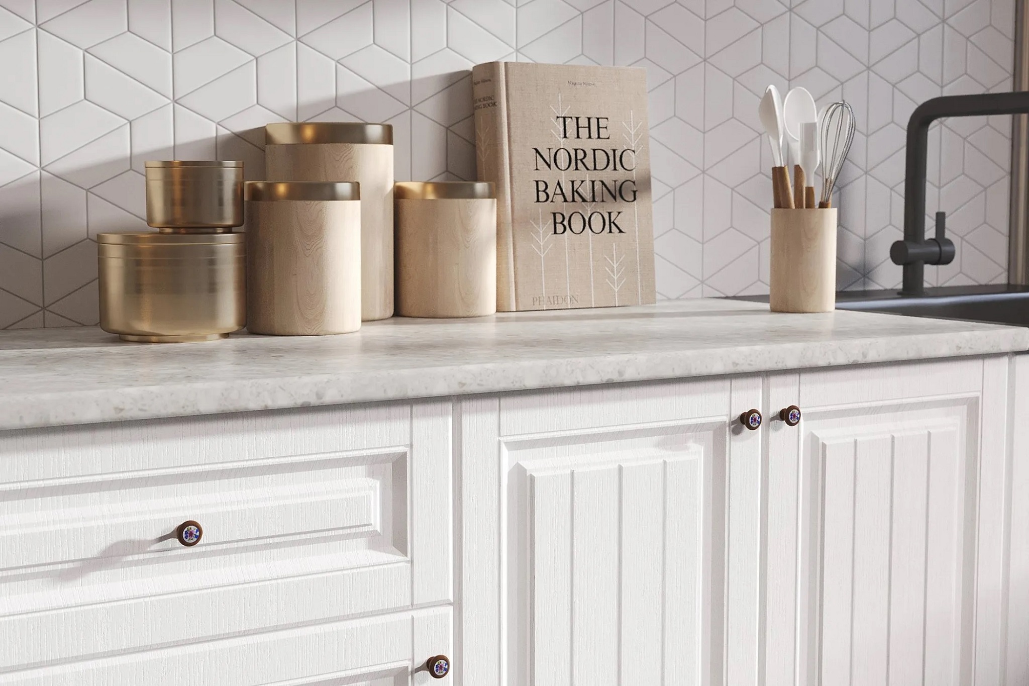 Несмотря на простоту дизайна модель объединила в себе самое необходимое для комфортного использования. Шкафы и столы оснащены необходимым количеством полок и отделений, где Вы сможете хранить бытовые принадлежности.Цвет фасада и каркаса от производителя: акация белая/белый