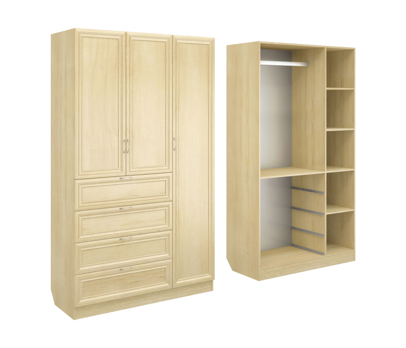 Корпус шкафа выполнен из Ламинированной ДСП высокого качества с насыщенным цветом. Фасады выполнены из материала МДФ.Ширина шкафа 120 см., большая и функциональная модель. Справа за длинной дверцей пять кубических ниш. Слева сверху вниз, узкая ниша, секция со штангой для одежды и четыре достаточно вместительных выдвижных ящика.