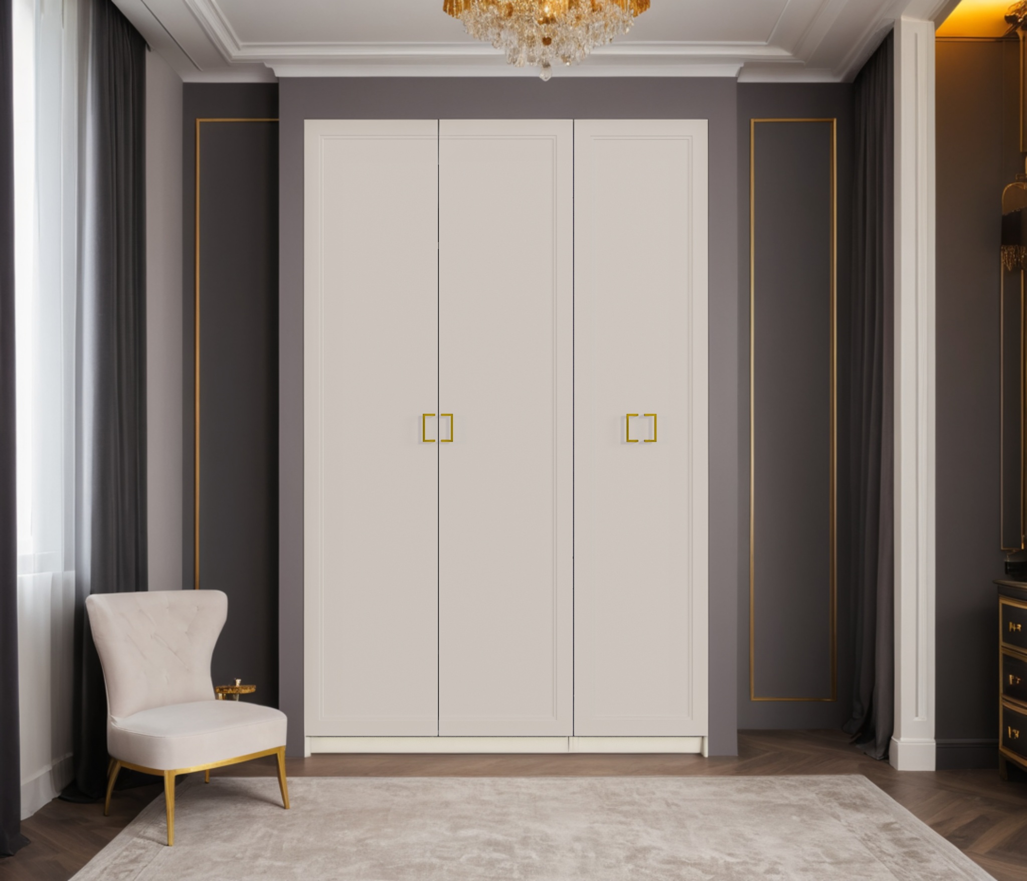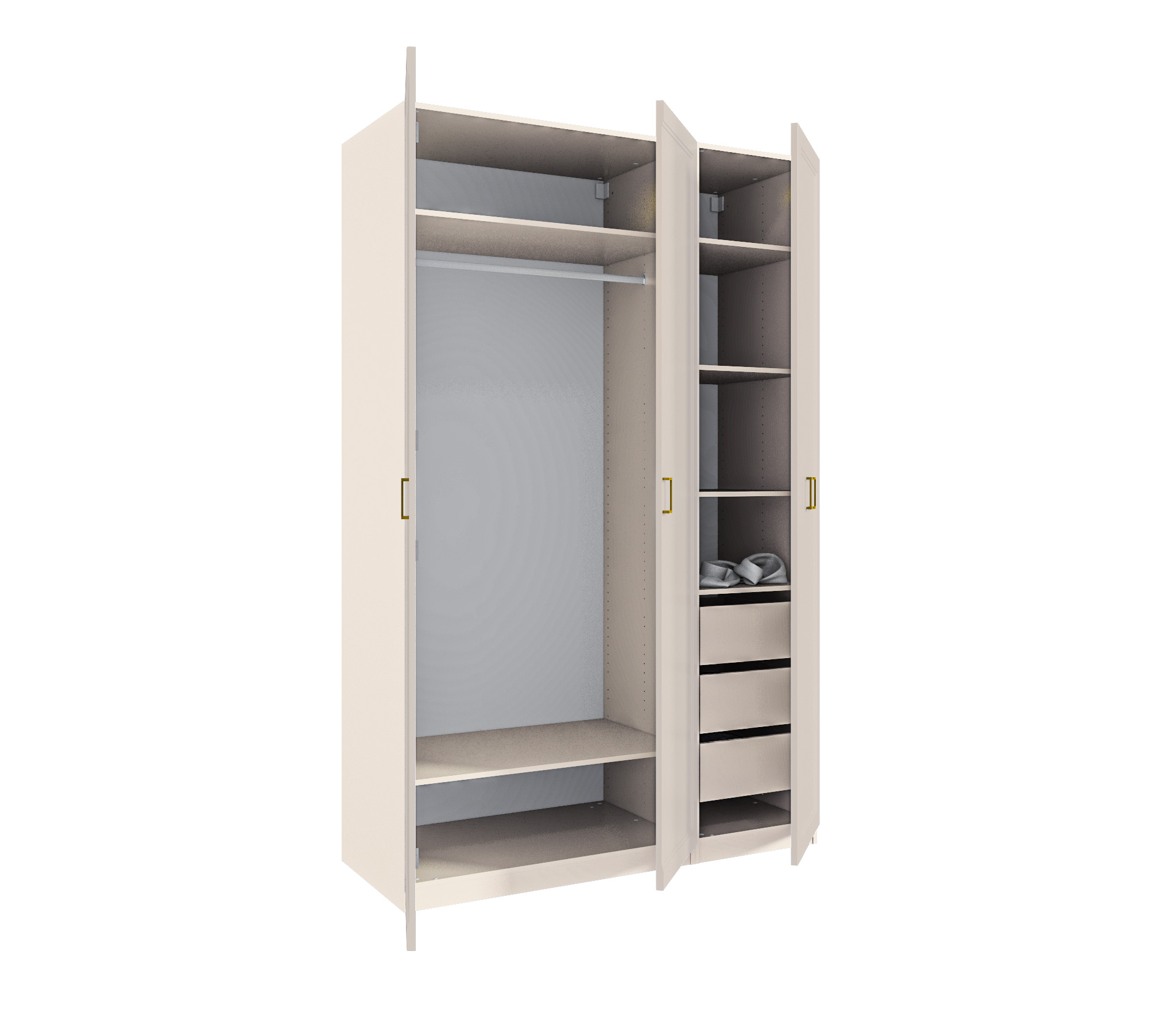Трехдверный шкаф Ассоль — элегантное и функциональное решение для хранения. Корпус выполнен из прочного ЛДСП, фасады из качественного МДФ с изысканными золотыми ручками. Внутреннее наполнение включает полки, ящики и штангу для одежды, обеспечивая удобство и порядок в вашем пространстве. Шкаф идеально впишется в любой интерьер, сочетая стиль и практичность.