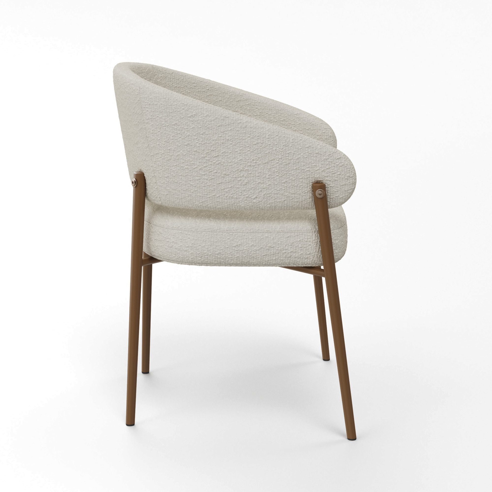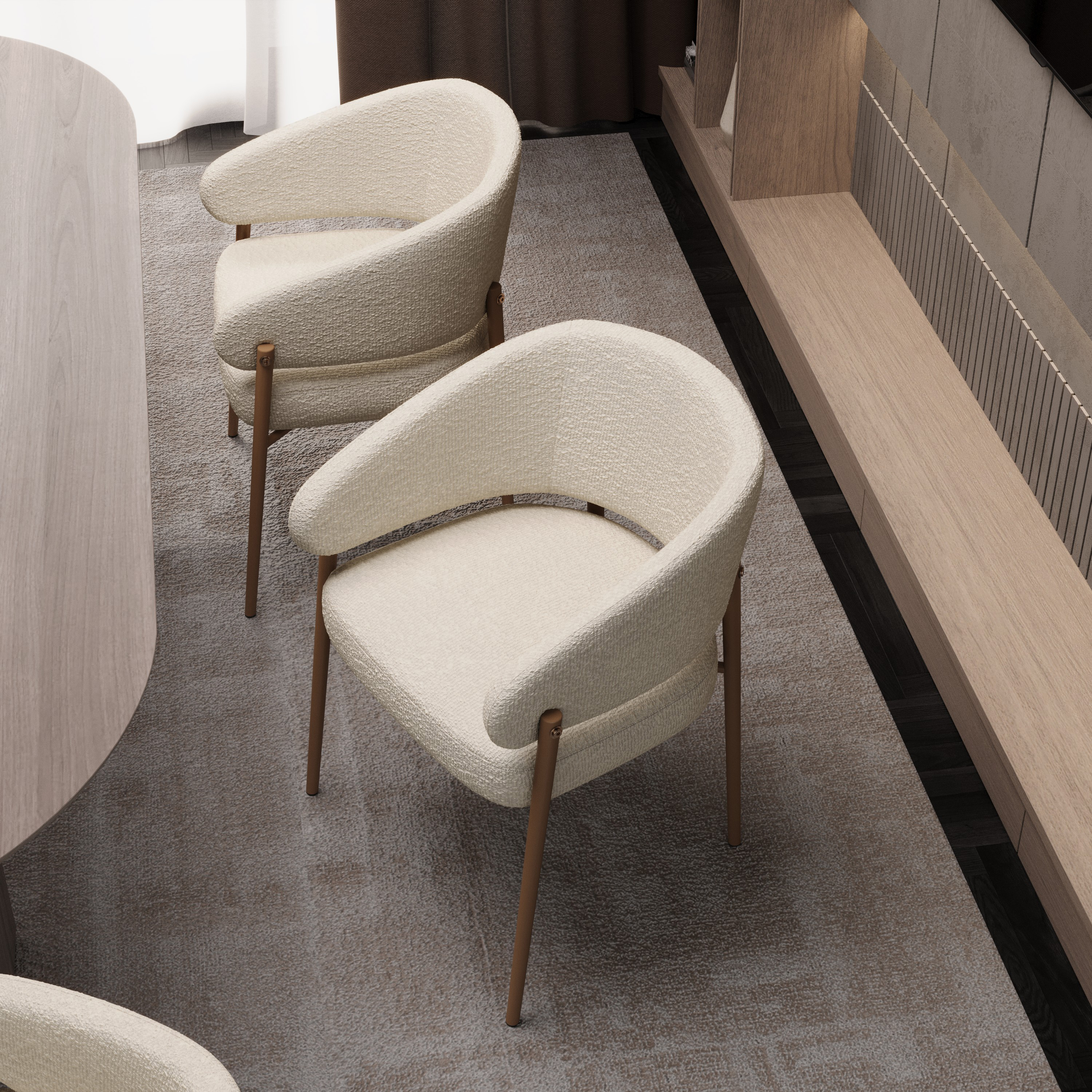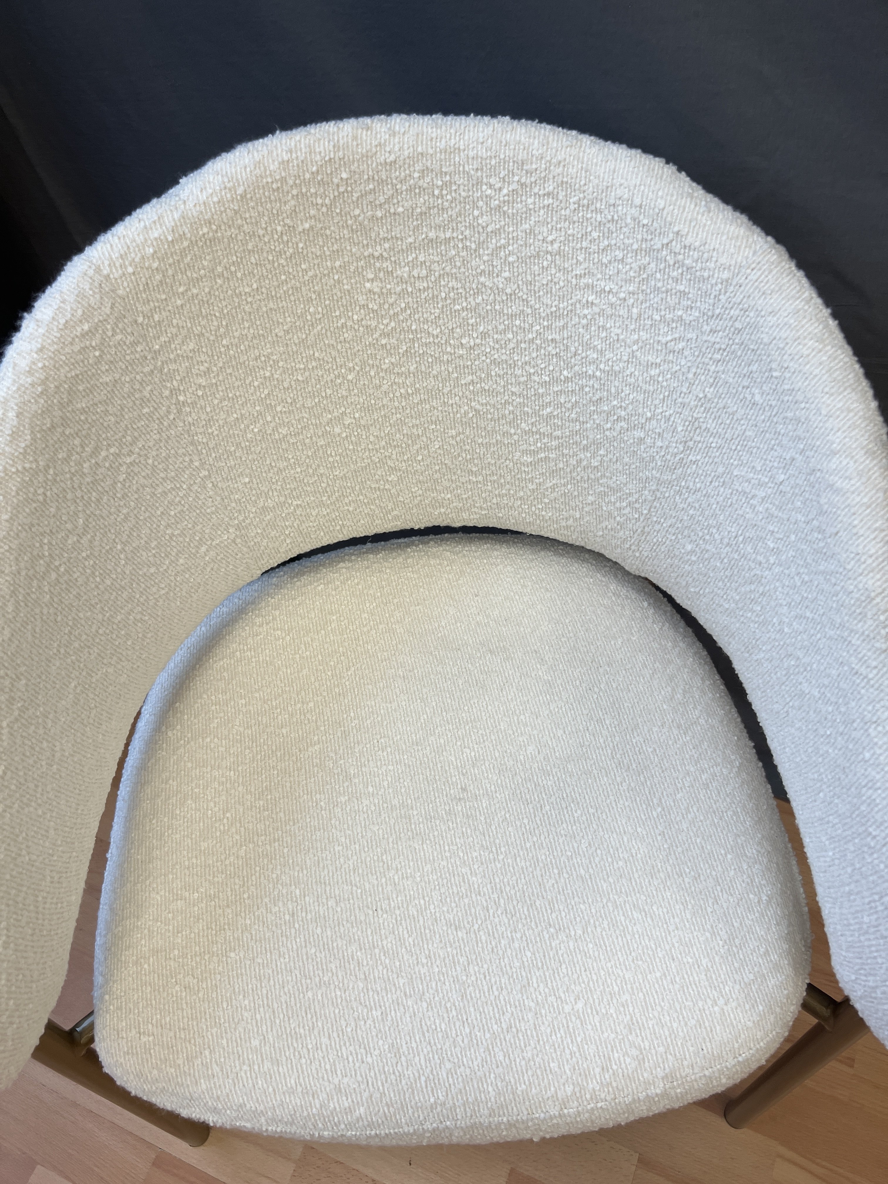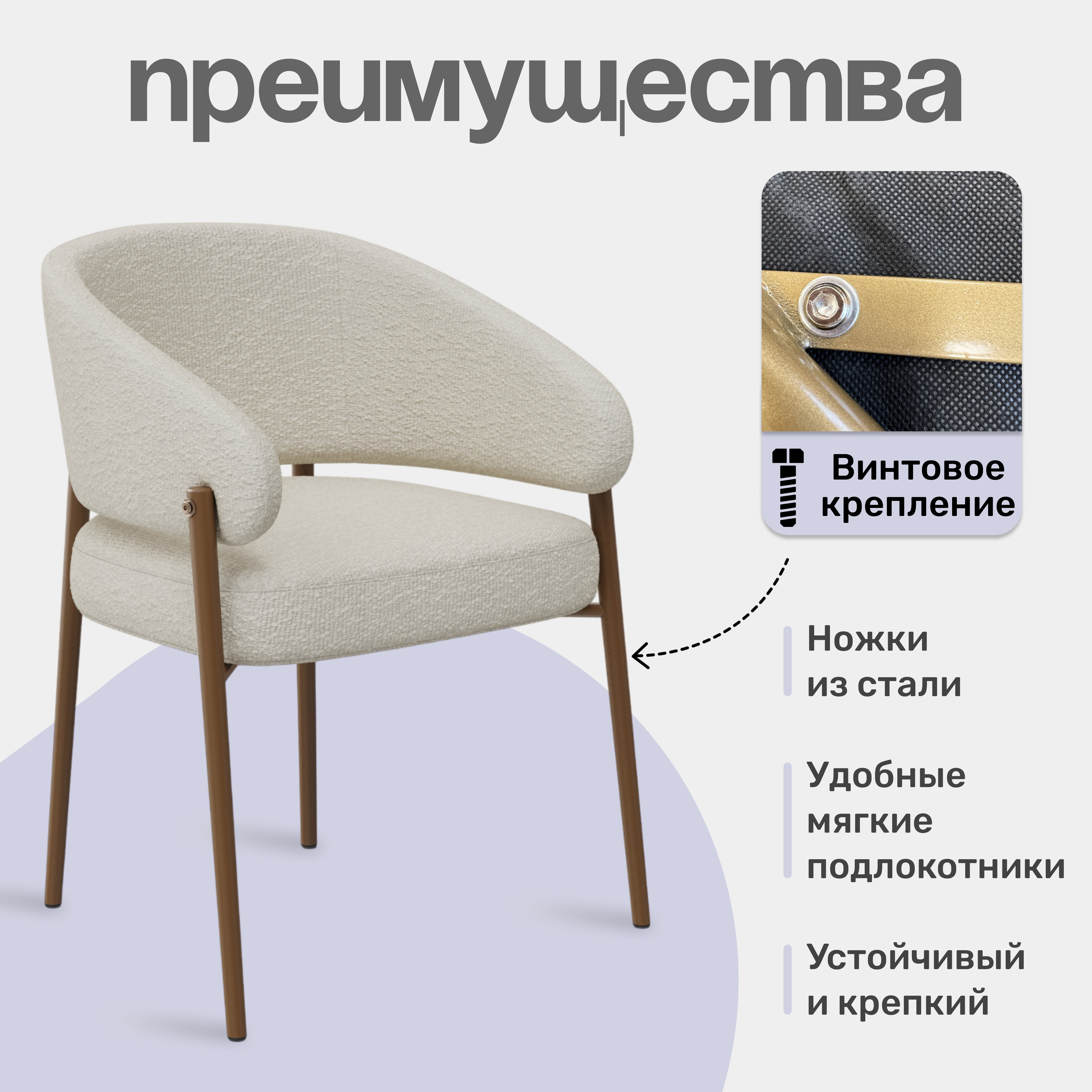 Кресло выполнено в бежевом цвете с золотистыми акцентами, что придает ему изысканный и современный вид. Обивка из букле, обеспечивает мягкость и комфорт при использовании.
