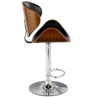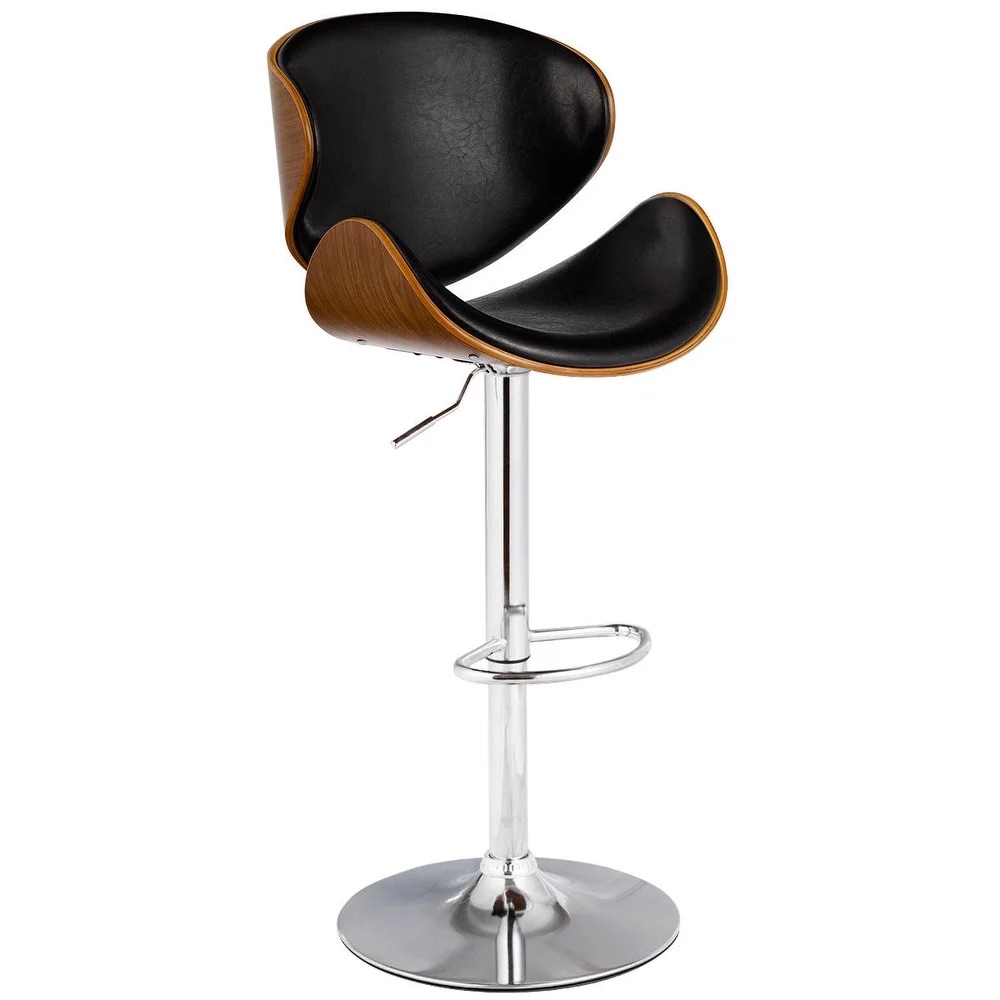 Металлическая ножка с хромированным покрытием придают стулу не только прочность, но и стильный внешний вид, создавая ощущение легкости и изящества. Лакированная выгнутая фанера сиденья обтянута качественной экокожей, которая доступна в элегантных черном цвете, обеспечивая комфортное прилегание и долгий срок службы.