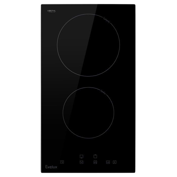 Варочная панель электрическая, стеклокерамика, Hi Light,30 см,2 конфорки,сенсорное управление, 9 уровней мощности,таймер 1-99 мин,блокировка управления, защитное отключение, защита детей,2900 Вт, вилка питания, черное стекло ILVA (Италия), 290мм x 520мм x 50мм.