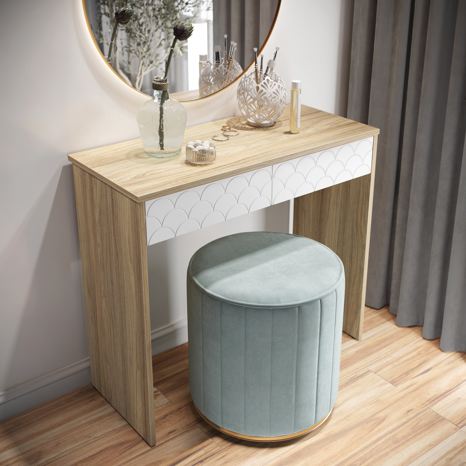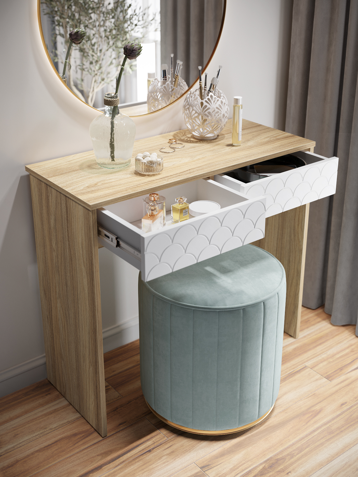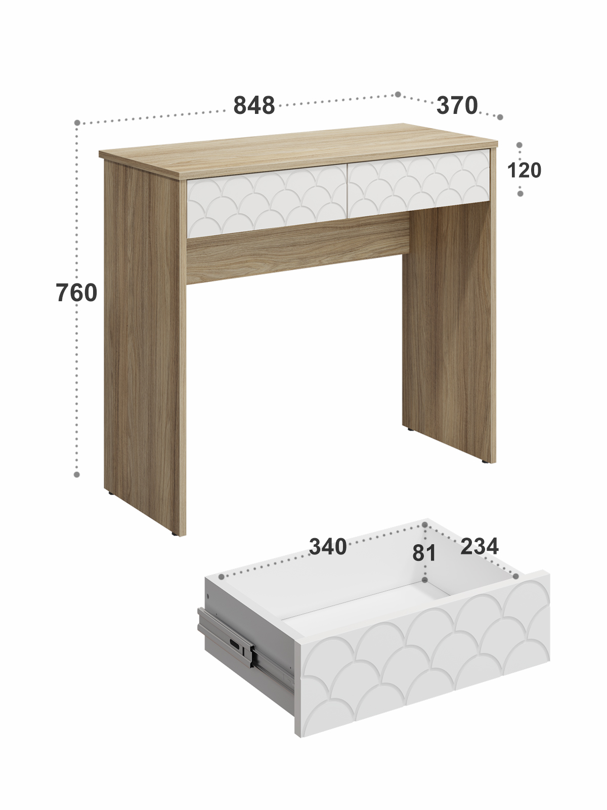 Размеры комплекта (ш/в/г) в мм: 848х760х370 Материал корпуса/фасада: ЛДСП 16мм, МДФ 16мм Стол туалетный Велламо ВО-09 рекрасно впишется в интерьер уютной и комфортной комнаты. Изделие поможет создать достаточно удобное место для наведения красоты. Широкая столешница позволит разместить под рукой все необходимые предметы. Вместительные выдвижные ящики, созданы для бережного хранения косметики, аксессуаров и украшений. Толщина столешницы ЛДСП 16 мм, дно ящика двп 3 мм. Свес крышки в 25 мм обеспечит прилегание к стене с любым плинтусом. Фурнитура: телескопические направляющие полного выдвижения без доводчиков, регулируемые опоры. Доставка и сборка: мебель поставляется в разобранном виде, в надежной упаковке, с подробной инструкцией по сборке. Сборка осуществляется самостоятельно или с привлечением специалистов.