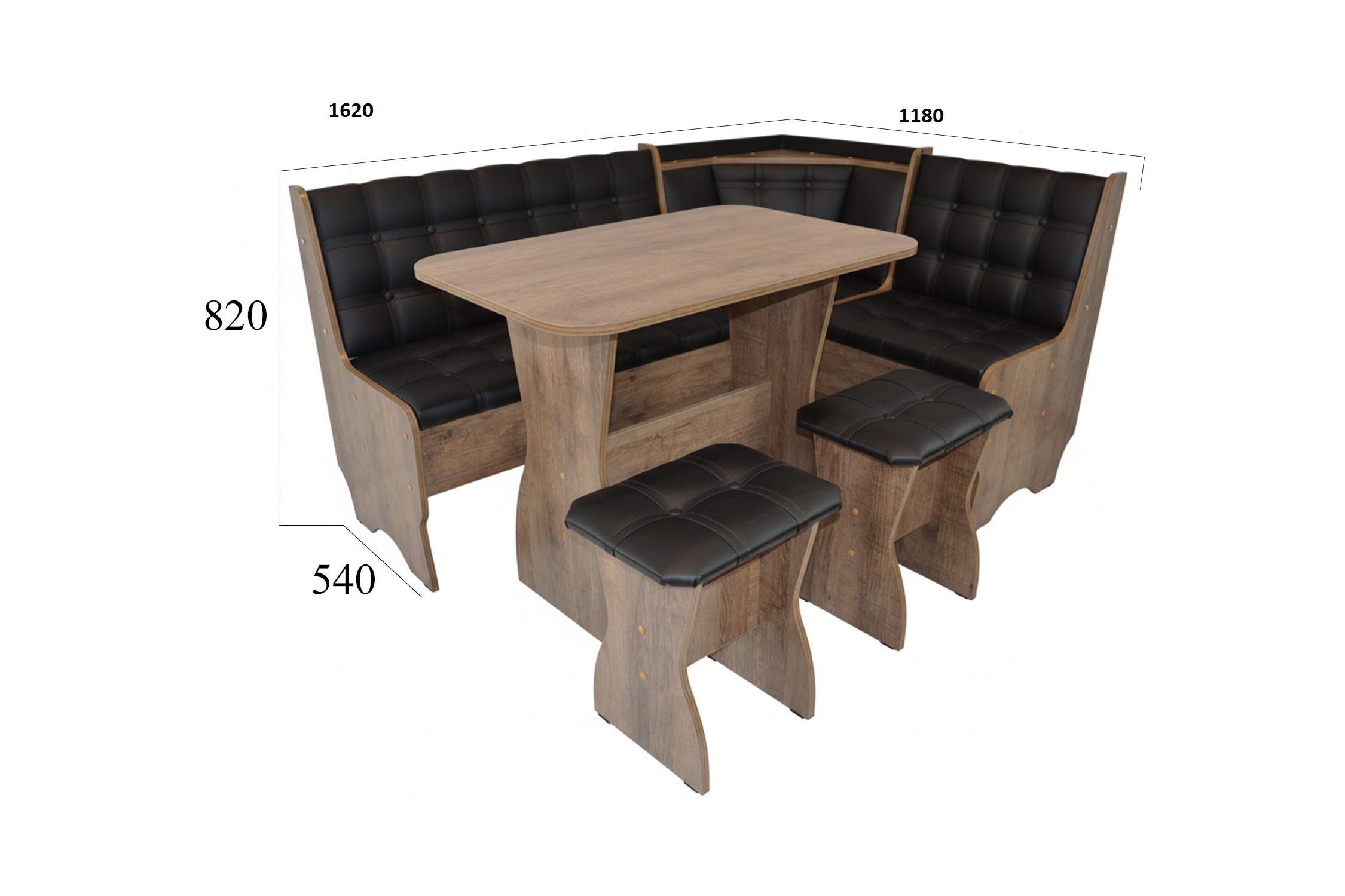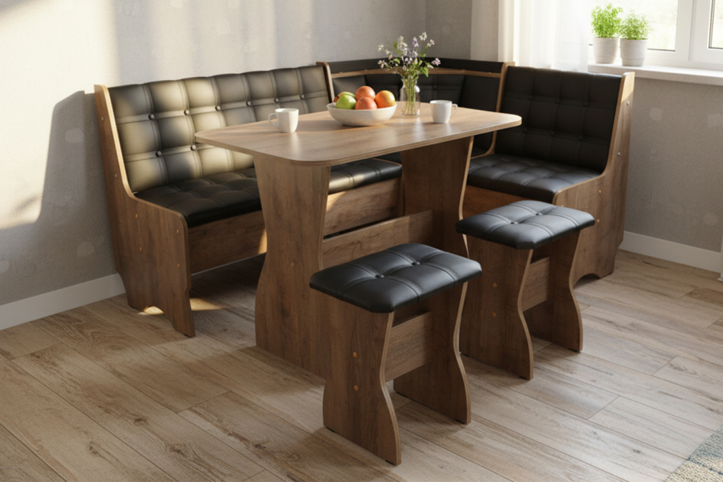 Кухонный уголок состоит из:Дивана углового,Стол прямоугольный НЕРАСКЛАДНОЙ Г*Ш*В 60*90*73 см.Изготовлен из ЛДСП.Обивка велюр ,наполнение поролон.Под сидениями дивана есть ящики для хранения.СБОРКА УНИВЕРСАЛЬНАЯ,КАК НА ЛЕВУЮ,ТАК И НА ПРАВУЮ СТОРОНУ!!!
