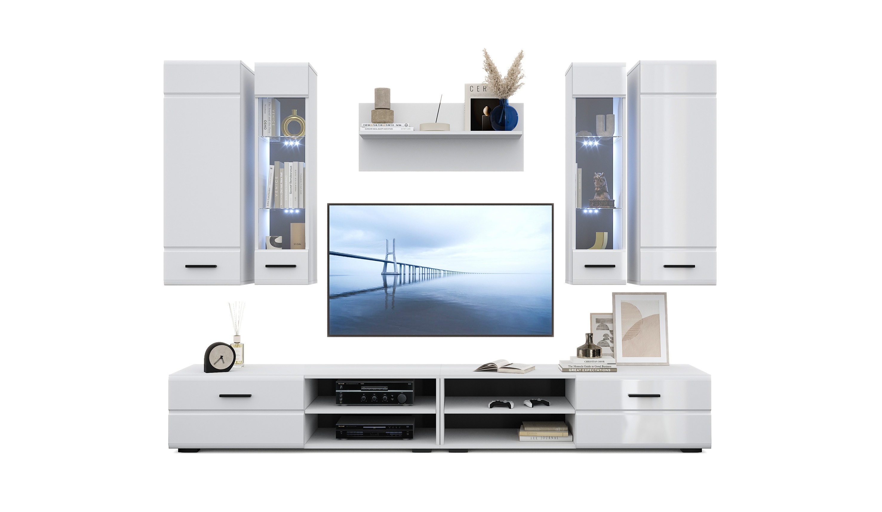 Стенка Кай - это универсальный комплект модулей в современных нейтральных тонах, простота форм и лаконичность которого позволяют вписаться в любой интерьер. Фасады МДФ с витринами и горизонтальной фрезеровкой добавляют динамики, делая композицию более яркой и выразительной. Контрастная задняя стенка и ручки черного цвета подчеркивают стиль и индивидуальность, оттеняют белоснежные глянцевые фасады. Функциональные шкафы и тумба для ТV обеспечивают удобство и простоту использования.