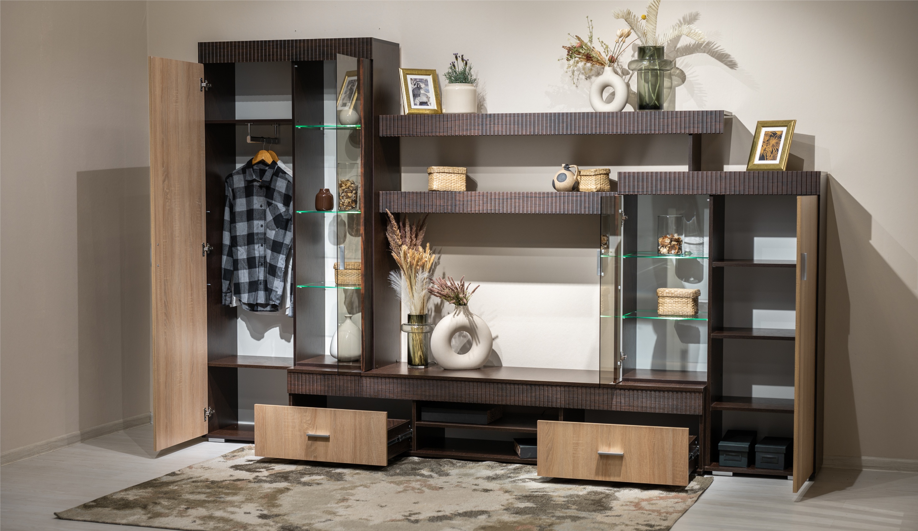 Марк - это готовое решение для гостиной и спальни в современном европейском стиле.Благодаря тщательно продуманной конструкции и правильному подбору цветов, позволяет создать уютную и теплую обстановку для отдыха и содержания дома в порядке.Отличительные особенности: утолщенные линии из рельефного МДФ, тонированные витрины со стеклянными полками, множество места для хранения при небольших размерах.
