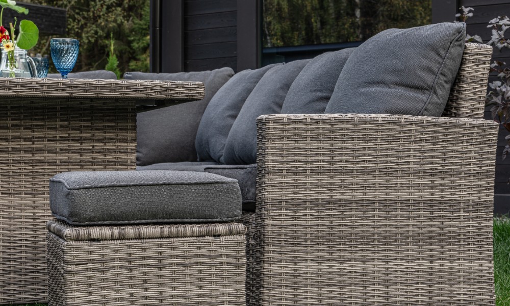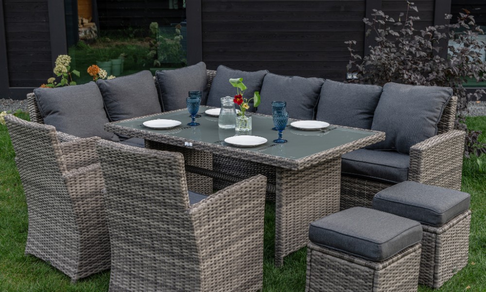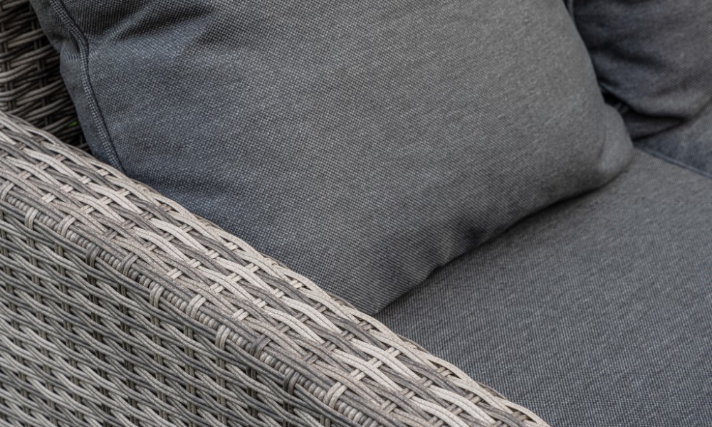 Комплектация и габариты: Диван прямой - 171x71x81 см Диван угловой- 183x71x81 см Кресло(2 шт) - 58x60x89 см Обеденный стол - 150x90x70 см Пуф (2 шт) - 40x40x33 см Материалы: Материал комплекта - искусственный ротанг (ручного плетения) Материал каркаса – сталь/алюминий, окрашенный порошковым методом Материал столешницы - закаленное стекло Материал чехла на подушки - олефин (водоотталкивающая ткань) Материал наполнителя подушек под спину - синтетический пух Материал наполнителя подушек для сидения - поролон Цвет комплекта - серый Цвет подушек - серые Дополнительная информация: Количество посадочных мест – 8-10 человек Максимальная нагрузка на посадочное место - 150 кг Чехлы съемные - да Температурный режим - от -50?C до +50?C Сочетается с комплектами бренда ROYAL FAMILY - ZOYA, KARL, GRAND VICKY, FIONA, VIOLETTA в коричневом цвете Накладки на ножки - да (пластиковые) Категория ротанга - первичная Держатели и крепления подушек зависят от поставки и не являются неотъемлемой частью комплекта Гарантия и эксплуатация: Гарантийный срок - 1 год Эксплуатационный срок - 10 лет Страна производитель - Китай
