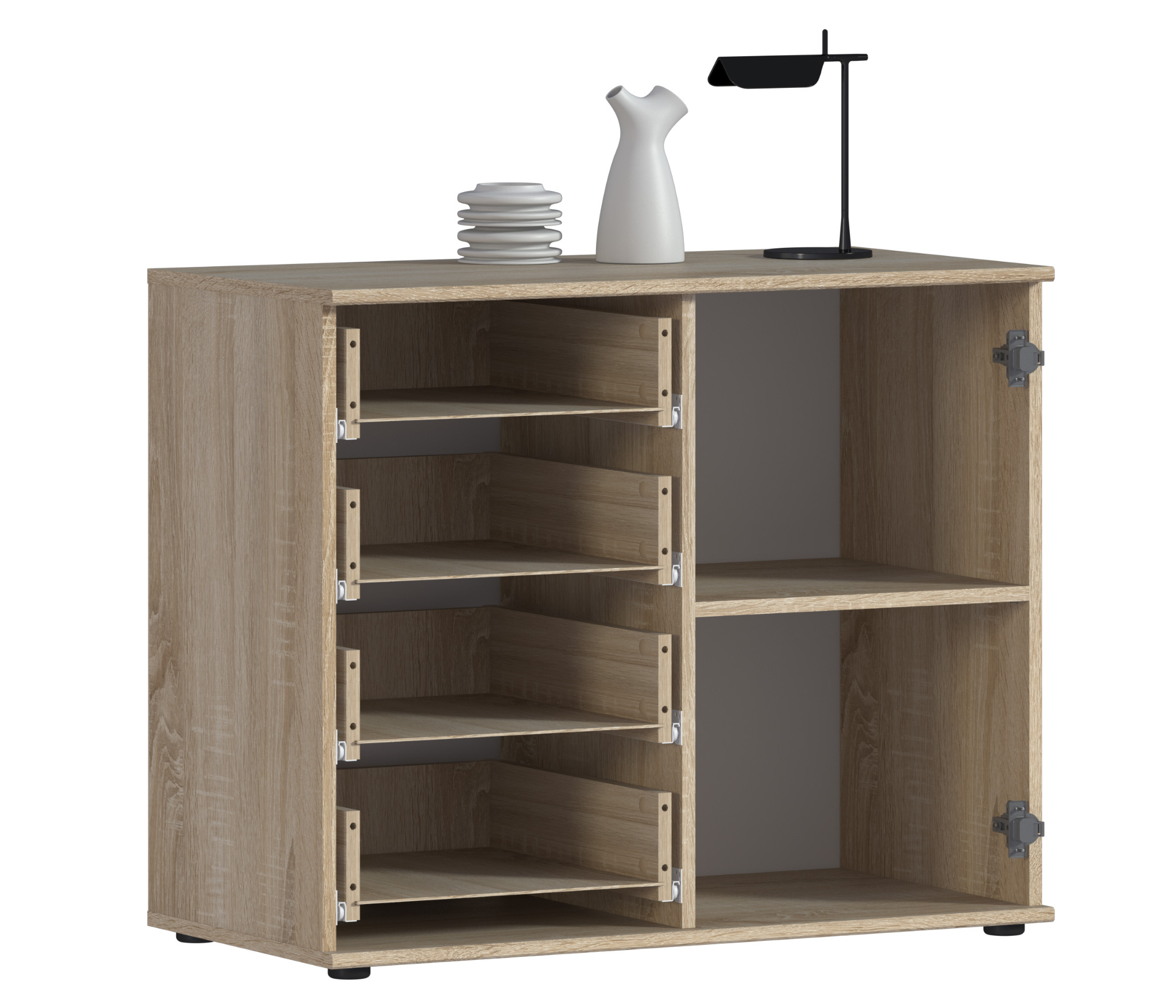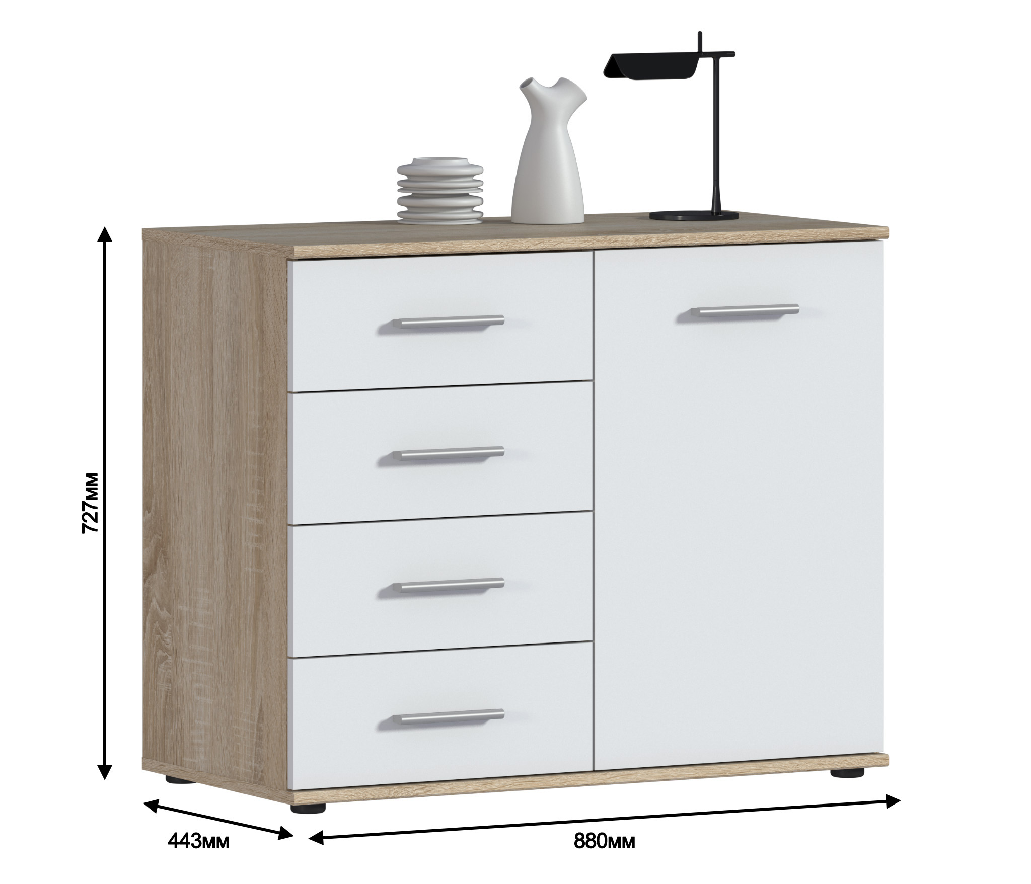 Комод Мамбо СБ-2752.Н станет идеальным решением вопроса хранения. Он будет органичным в гостиной, прихожей, кабинете, детской, спальне. ¶Размеры комода – ширина 88 см, высота 72 см и глубина 44 см. Под одной столешницей объединены четыре выдвижных ящиков и тумба. Тумба оснащена двумя довольно высокими полками.