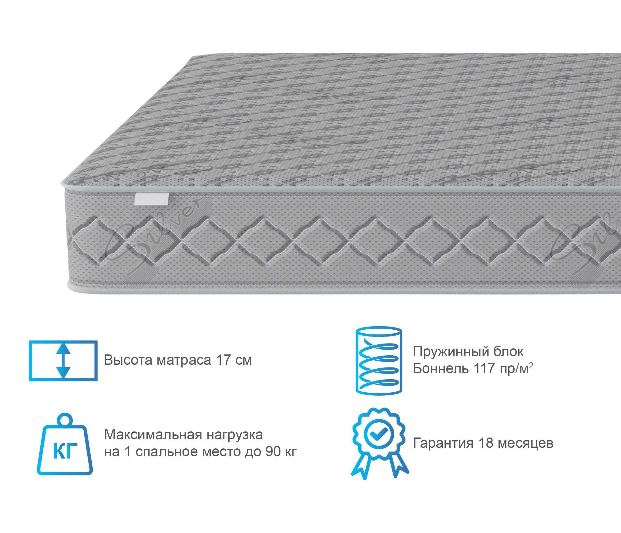 Односпальный матрас дополнен чехлом, изготовленным из ткани синтетический жаккард, стеганный на синтепоне 200 г/м2. Это современное и очень прочное полотно.