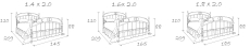 Размеры спального места (ДхШ) 2000х1400, высота изножья 880 мм, максимальная нагрузка на 1 спальное место - 150 кг.