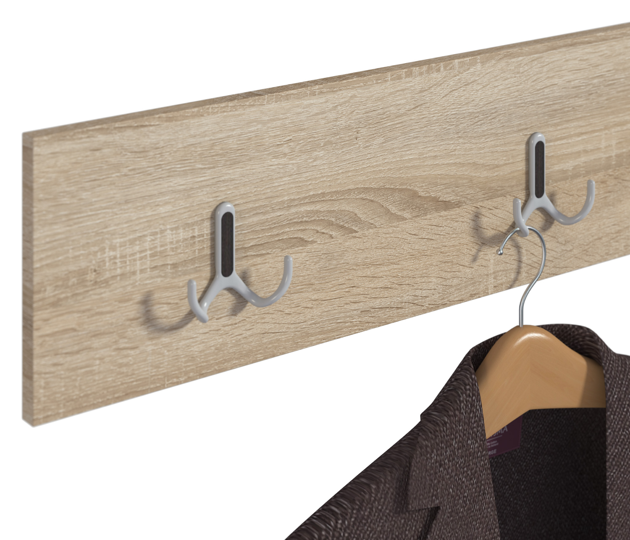 Афина СБ-2244 – настенная вешалка из модульной коллекции Афина. не занимает много места и в равной степени подходит для оформления больших прихожих и узких коридоров. При необходимости можно повесить несколько вешалок: неброский силуэт не привлекает к себе чрезмерного внимания и не загромождает пространство. Спокойный цвет «Дуб Сонома» в сочетании с лаконичным дизайном легко впишется в любой интерьер. Габаритные размеры – ширина 118 см, высота 19 см и глубина 1 см. Выполнена вешалка из прочного КДСП, облицована декоративной плёнкой в оттенке «Дуб Сонома». Вешалка оснащена четырьмя прочными крючками. В комплект входят необходимые для крепления детали.