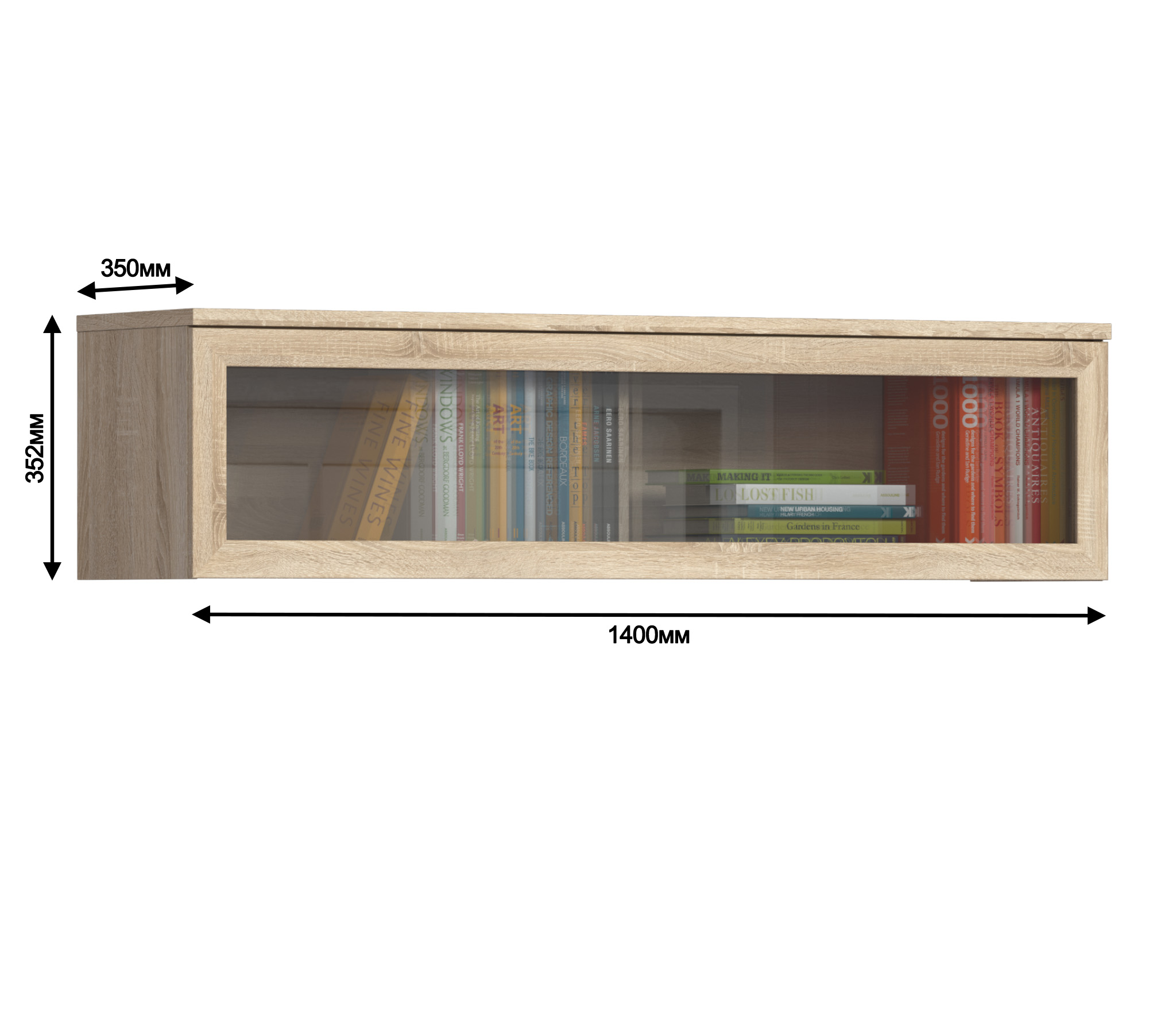 Габаритные размеры – ширина 140 см, высота 35 см и глубина 35 см. За остекленной дверцей находятся два вместительных отделения, куда можно складывать книги, посуду или сувениры.