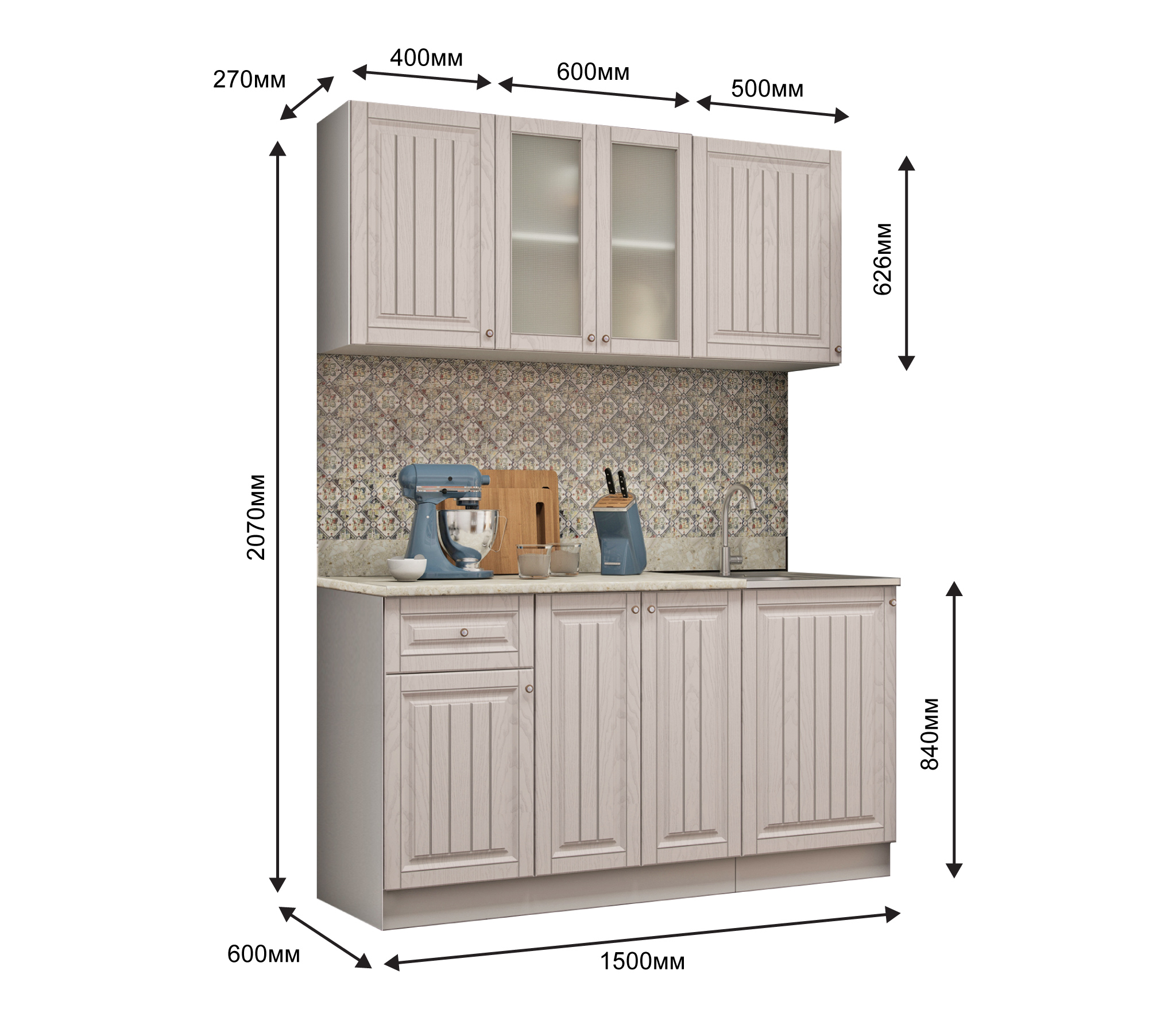 два верхних шкафа - общая ширина 1000мм (400-глухой , 600-со стеклом) и на 500мм. Высота 626мм. Глубина 270 мм.