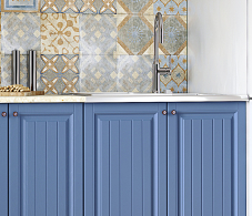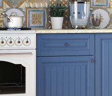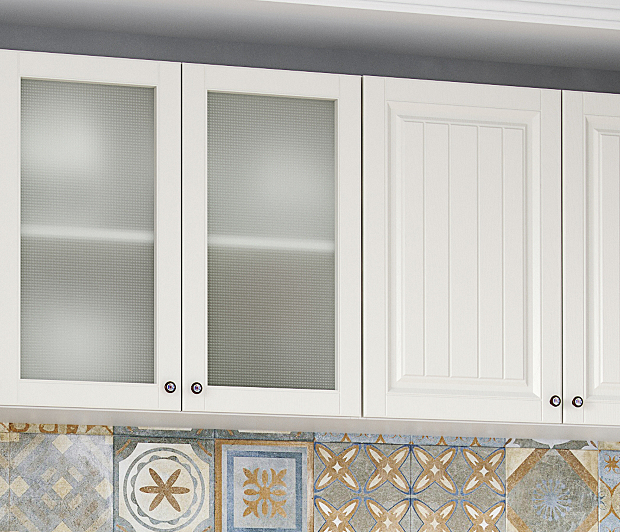Сочетание цветов, фасады, нежные ручки, не прозрачное стекло.