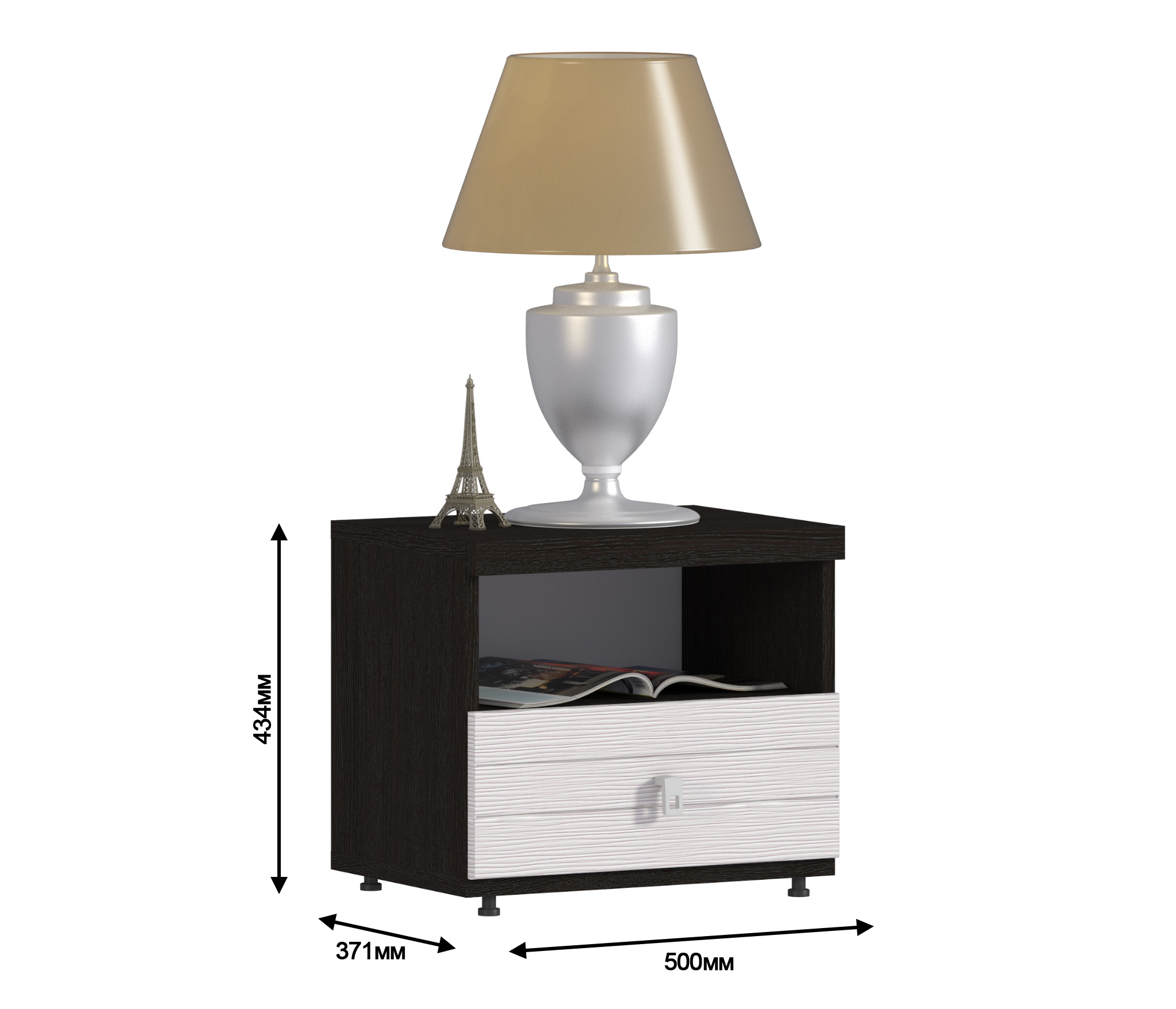Стильная, современная прикроватная тумба. Она не просто интересного дизайна, но и отлично подобраны цвета. Удобно, что есть открытое пространство и выдвижной ящик. Вместительность у нее нормальная.Заказали две. Качество для такой цены считаю просто отличным. Доставили и собрали в сроки. Будем всем рекомендовать.