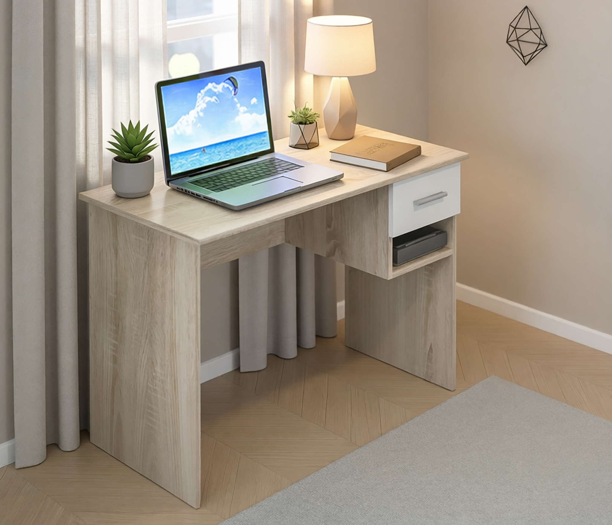 Письменный стол Мамбо СБ-2370 – комфортное рабочее место, где можно разместить ноутбук или любое периферийное оборудование. Идеален для детской комнаты или комнаты подростка. Его можно дополнить элементами из модульной коллекции Мамбо. Габаритные размеры – ширина 103 см, высота 71 см, глубина 50 см. Под столешницей размещен вместительный выдвижной ящик, под ящиком – открытая полка. Модель производится из прочного КДСП. Корпус в цвете «Дуб Сонома». Текстура отделки практически не отличается от природного дерева. Фасады оформлены в белом цвете.