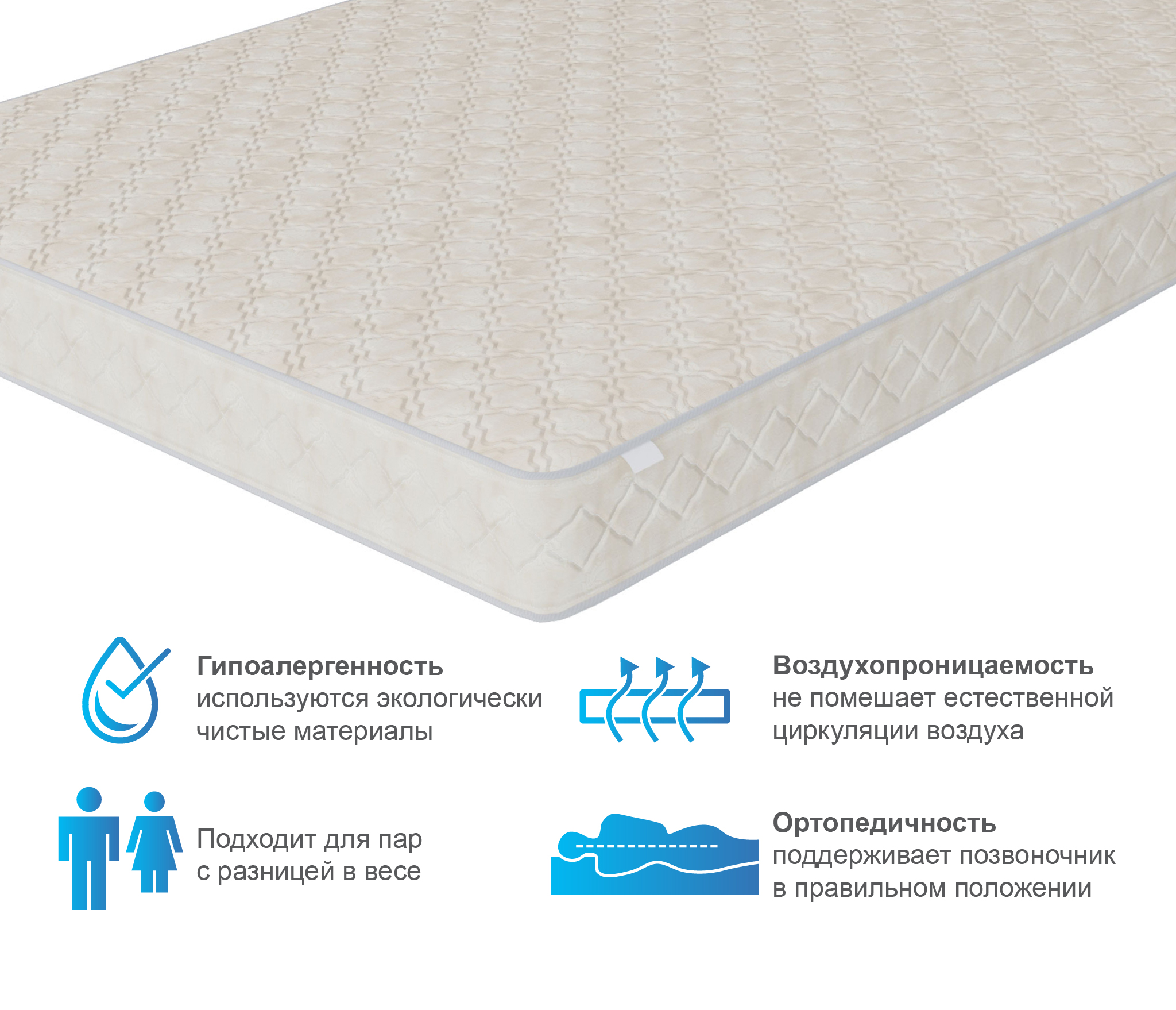 В качестве внутреннего слоя матраса используется Струттофайбер Лён - это современный материал, превосходный по своим ортопедическим свойствам. Он упруг и мягок, обладает теплозащитным и звукопоглащающим эффектом. На матрасе достигается максимальное расслабление, а значит и наиболее эффективный отдых. Система усиления периметра матраса обеспечивает упругость, достаточную для сохранения первоначальной формы матраса.
