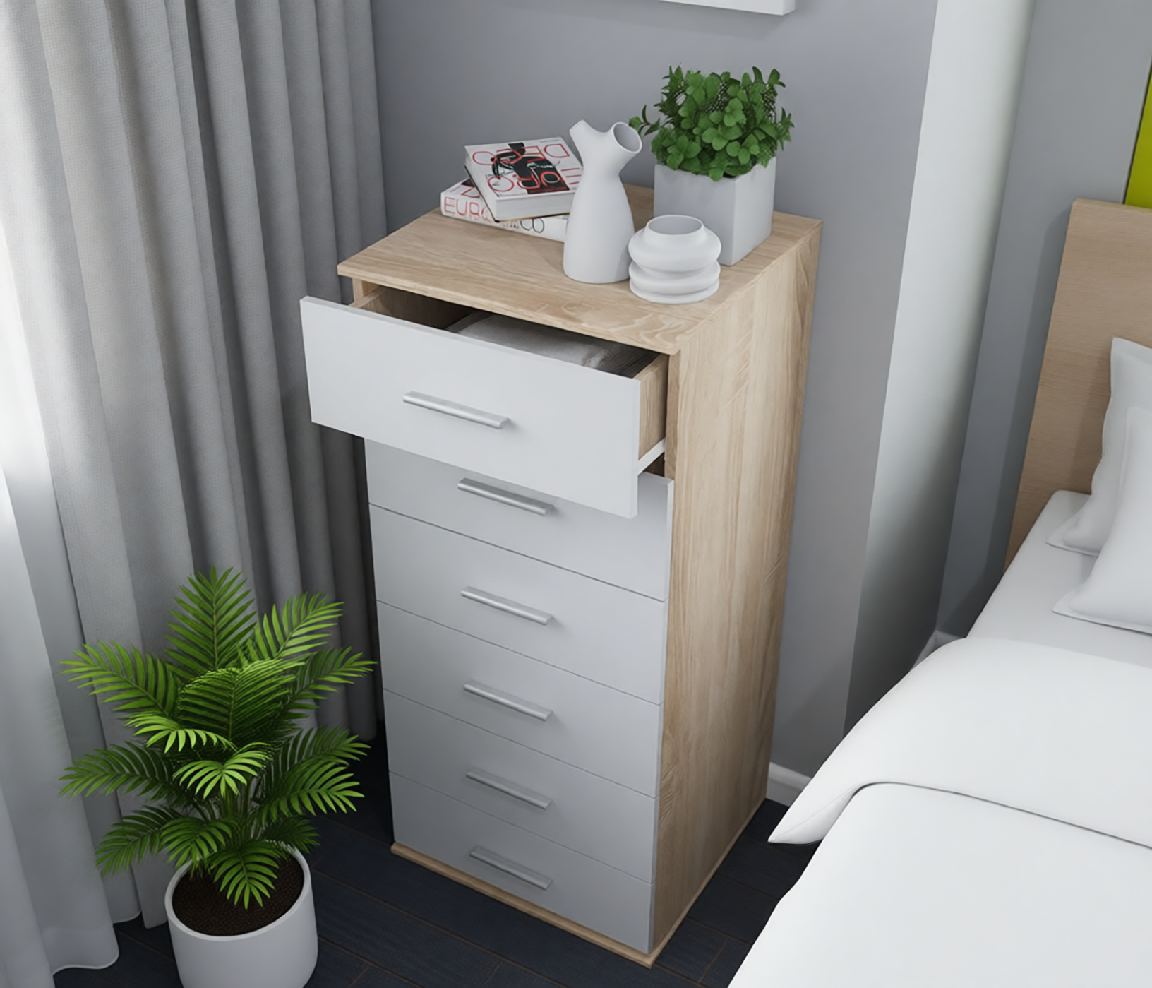 Выполнен комод Мамбо из современного материала. Основной цвет отделки -- «Дуб Сонома», а фасады выдвижных ящиков имеют белое матовое покрытие.