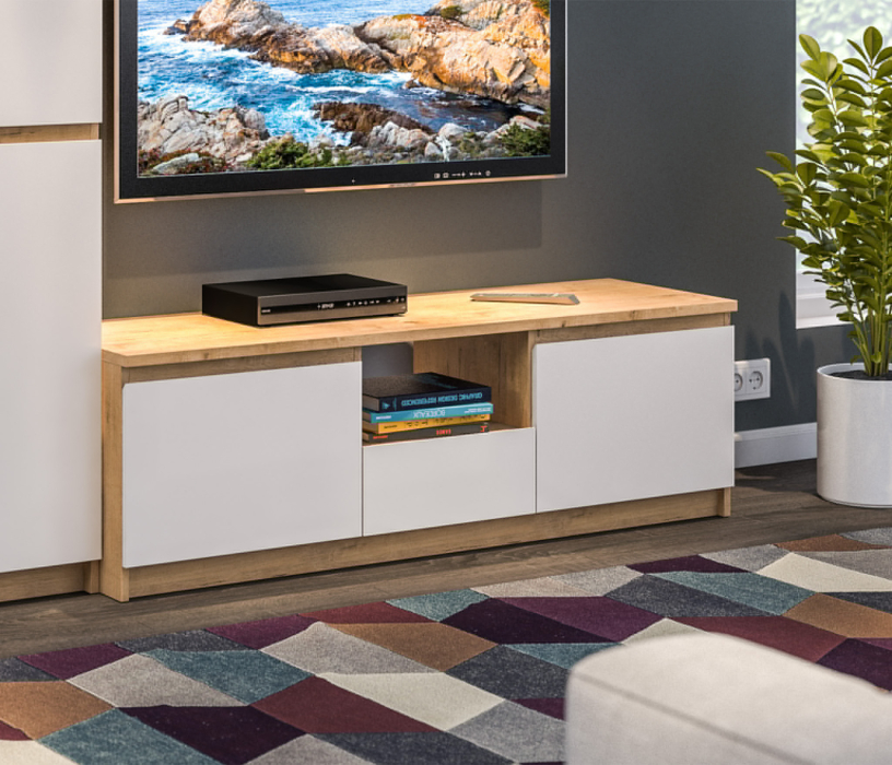Габаритные размеры – ширина 140 см, высота 44 см и глубина 44 см. Вес тумбы 33,92 кг, что даёт возможность передвигать её по усмотрению. Визуально тумбу можно разделить на три отделения. В центре над выдвижным ящиком расположена открытая полка. По бокам два вместительных отделения за отдельными дверцами. Отличительной особенностью тумбы является отсутствие ручек, которые интегрированы в фасады. ¶Тумба выполнена в лаконичном дизайне из экологичного современного ЛДСП. Материал отделки устойчив к влаге и воздействию бытовых чистящих средств, что актуально для светлых поверхностей.