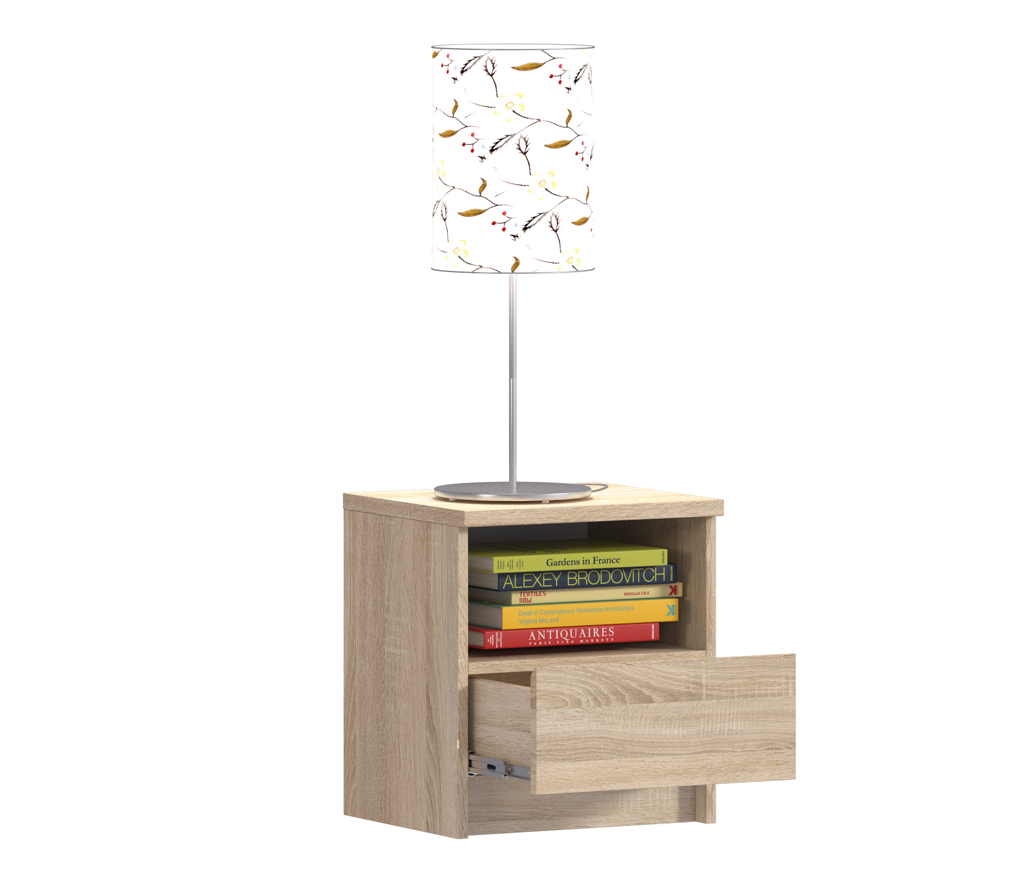 Габаритные размеры тумбы - ширина 40 см, высота 44 см, глубина 35 см, Один выдвижной ящик и открытое отделение, куда положить планшет или книгу. Стиль тумбы современный - Сканди, хай тек. Наиболее выигрышно тумба будет смотреться в интерьере в сочетании с другими предметами мебели из коллекции "Веста". Корпус и фасад тумбы выполнен из современного и прочного ЛДСП.