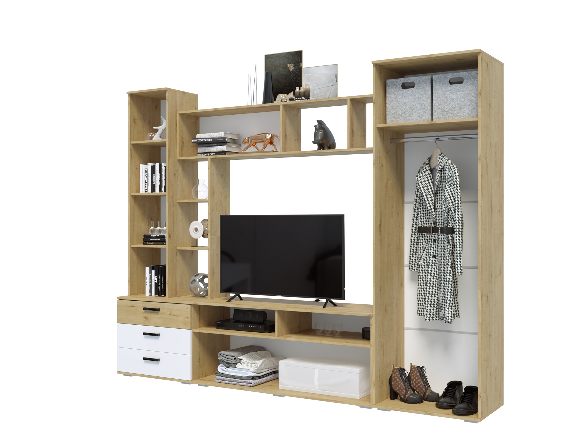 Отличная стенка! Удачное сочетание цветов, смотрится здорово! Есть куда повесить одежду, много полок, большая ниша под телевизор. Очень довольны покупкой! Спасибо!