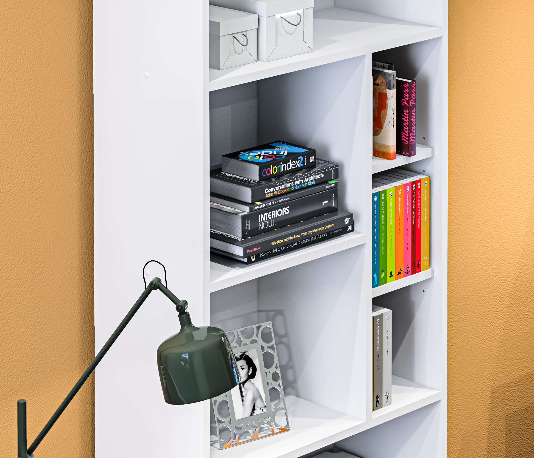 Габаритные размеры – ширина 65 см, высота 182 см и глубина 28 см. Конструкция стеллажа представляет собой ряд открытых полок на пяти уровнях. Две нижних и верхняя полки одинакового размера. Две средних полки поделены на секции. Выполнен стеллаж из современного прочного материала ЛДСП. Материал отделки чисто белого цвета, устойчив к влаге и воздействию бытовых моющих средств. Стеллаж оснащен протекторами или «лапками», которые не дают повредить пол. Для обеспечения максимальной устойчивости стеллаж надежно крепится к стене. Все необходимые крепёжные элементы входят в комплект.